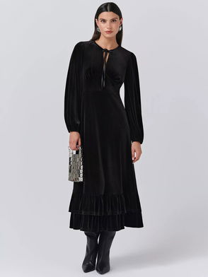 Quietly dramatic is how we would describe Elenanor, a midi dress that’s rich in vintage-inspired details but feels completely contemporary. Featuring a keyhole front opening, voluminous 3 1/4 length sleeves and a frill-tiered skirt, it’s crafted from soft velvet jersey fabric. Style it with heeled boots for a high-impact look.