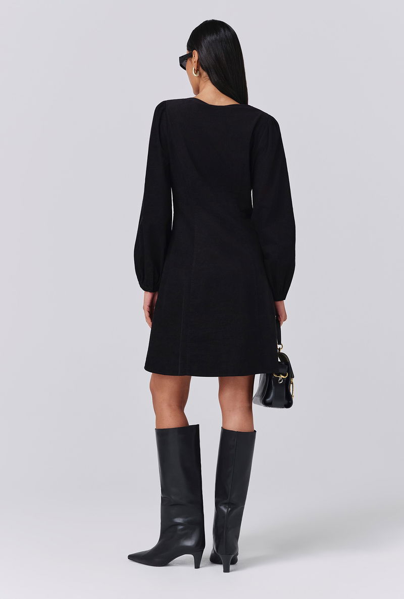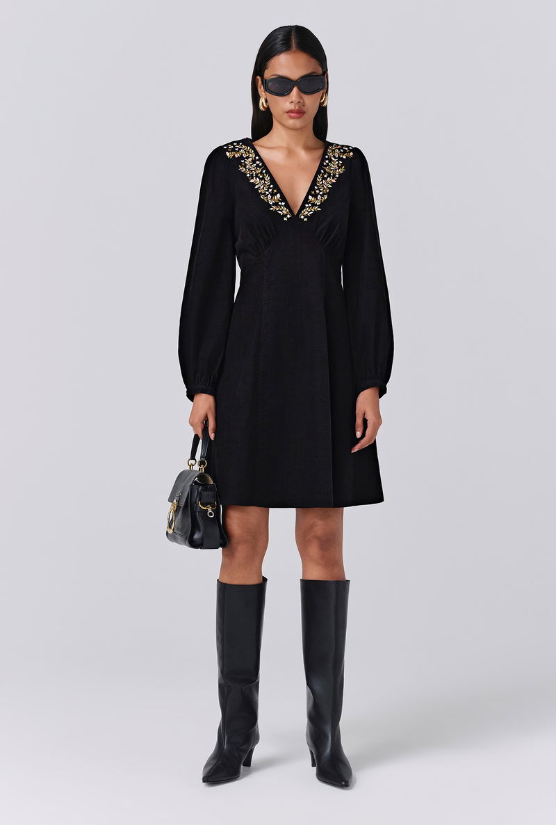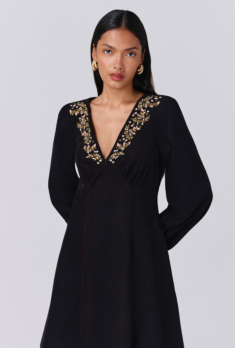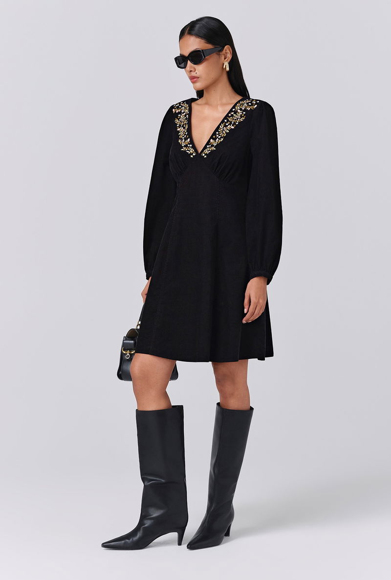 Crafted from soft corduroy, the Eliza mini dress brings luxurious texture to your wardrobe. Its feminine silhouette is defined by a flattering V-neck, delicate embroidered details, and elegant long sleeves with a cuffed finish. A concealed side seam zip ensures a perfect fit. Step into style with this truly special piece.