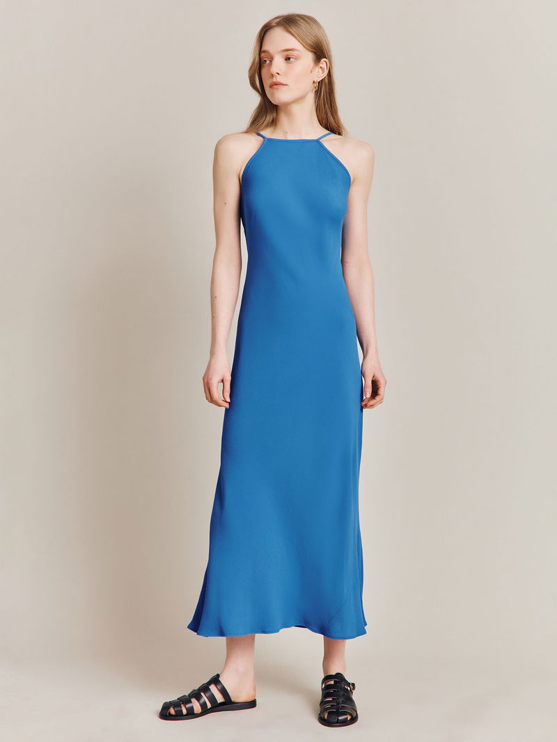 Instantly charming in a slip shape, this mid-length dress from Ghost is made from liquid-like viscose. Carved with a halter neckline, this sleeveless style needs no prints or accents to hold the spotlight.
