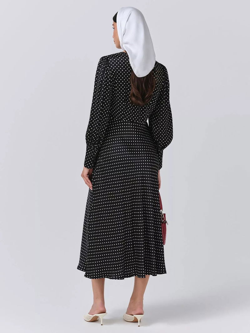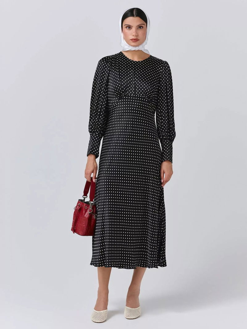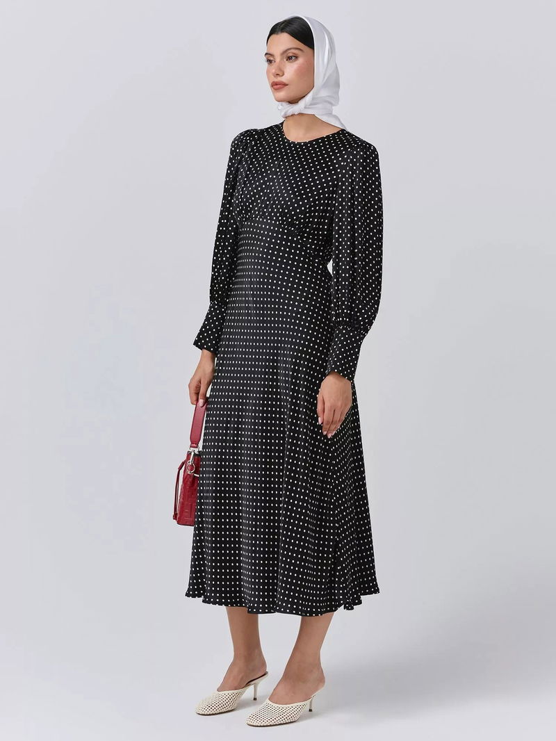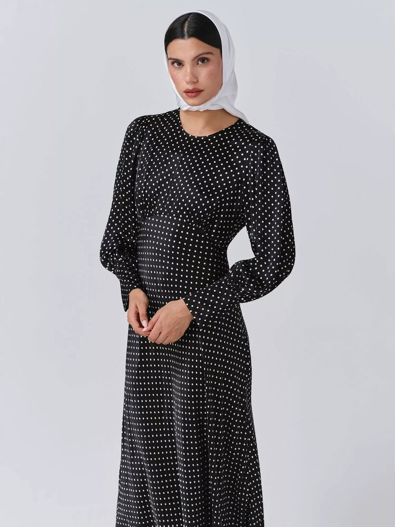 Refined style at its very best, Fiona is an elegant bias cut midi dress that will work for a variety of occasions for years to come. Featuring a simple round neckline, long sleeves with extended cuffs and button detailing, a flattering under bust seam and crafted from a timeless polka dot print satin for maximum comfort and wearability.