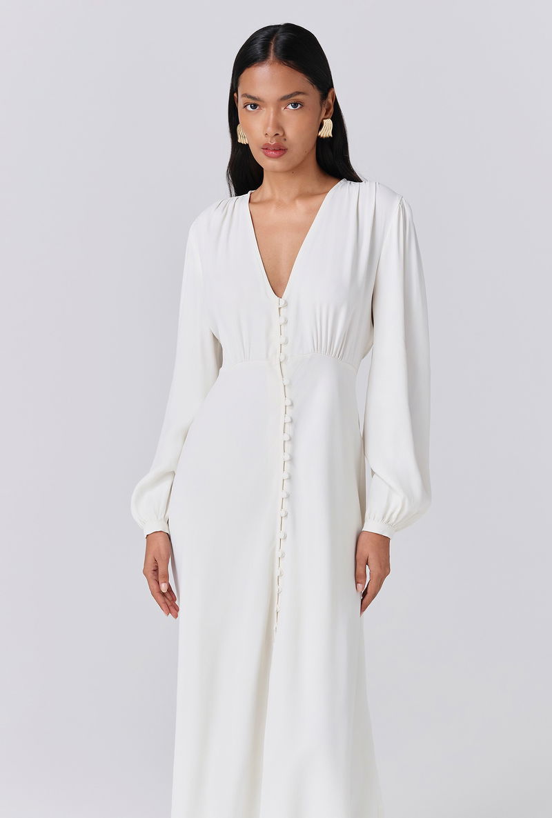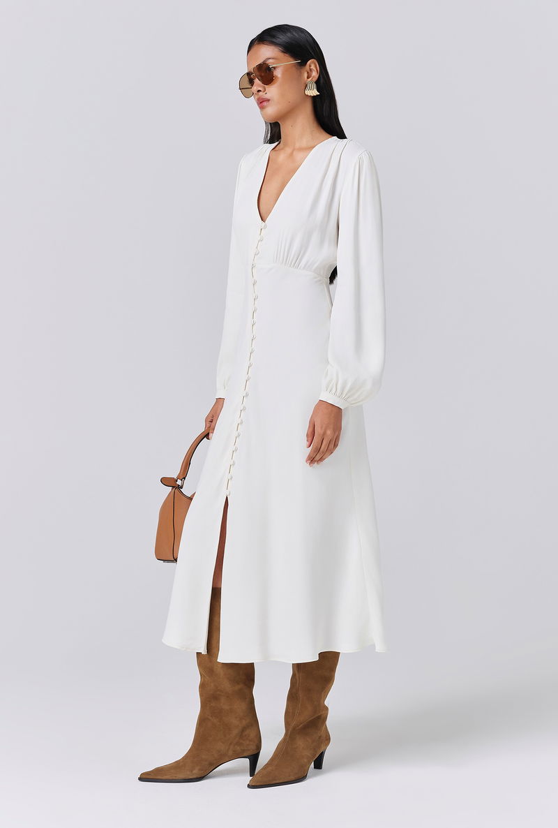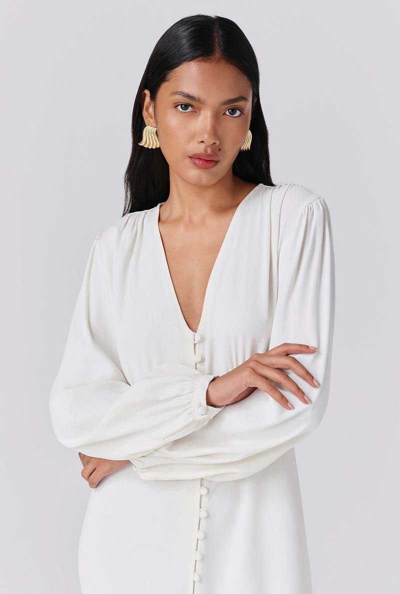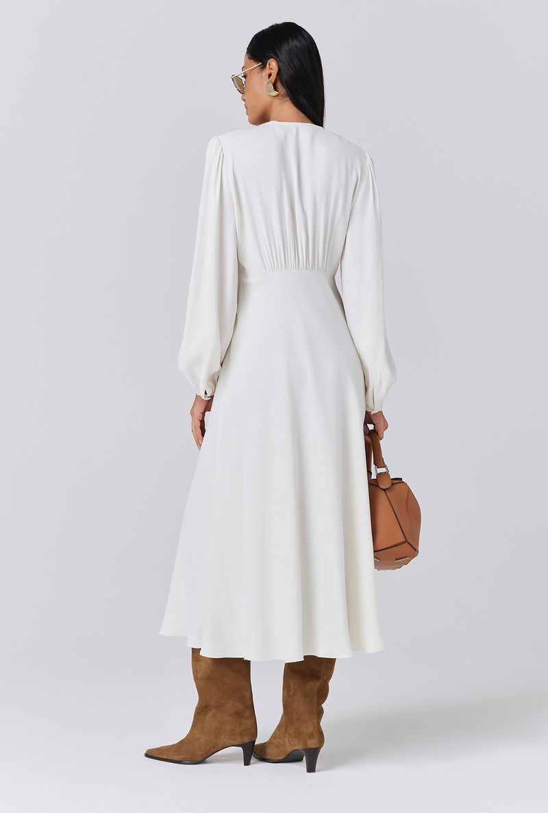 Francesca is a multitasking must-have designed with ease in mind. The perfect piece to slip on and go, this midi-length style is crafted from our signature crepe fabric for maximum comfort and beautiful structure. With long voluminous sleeves, delicate covered button detailing, v neckline, flattering underbust seam and bias cut skirt, it’s a dress that can take you almost anywhere - from work to special occasions. Accessorise or keep it simple, Francesca adapts to you.