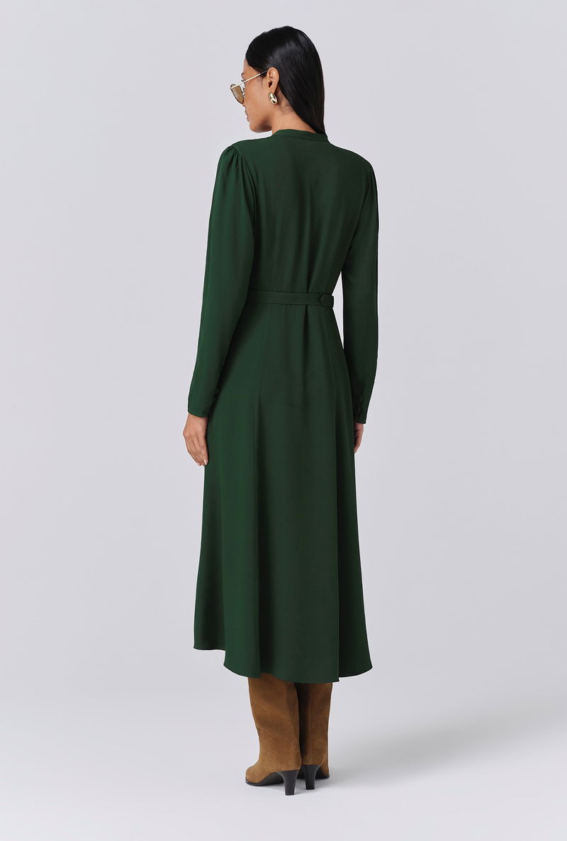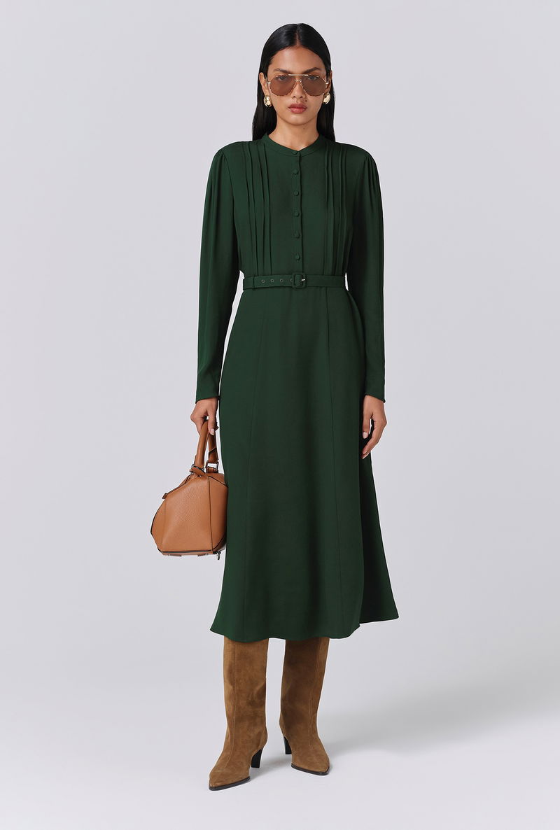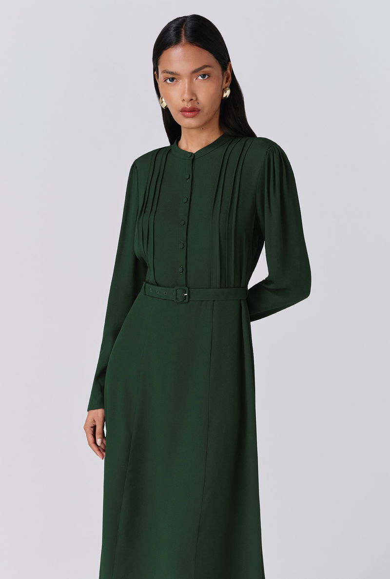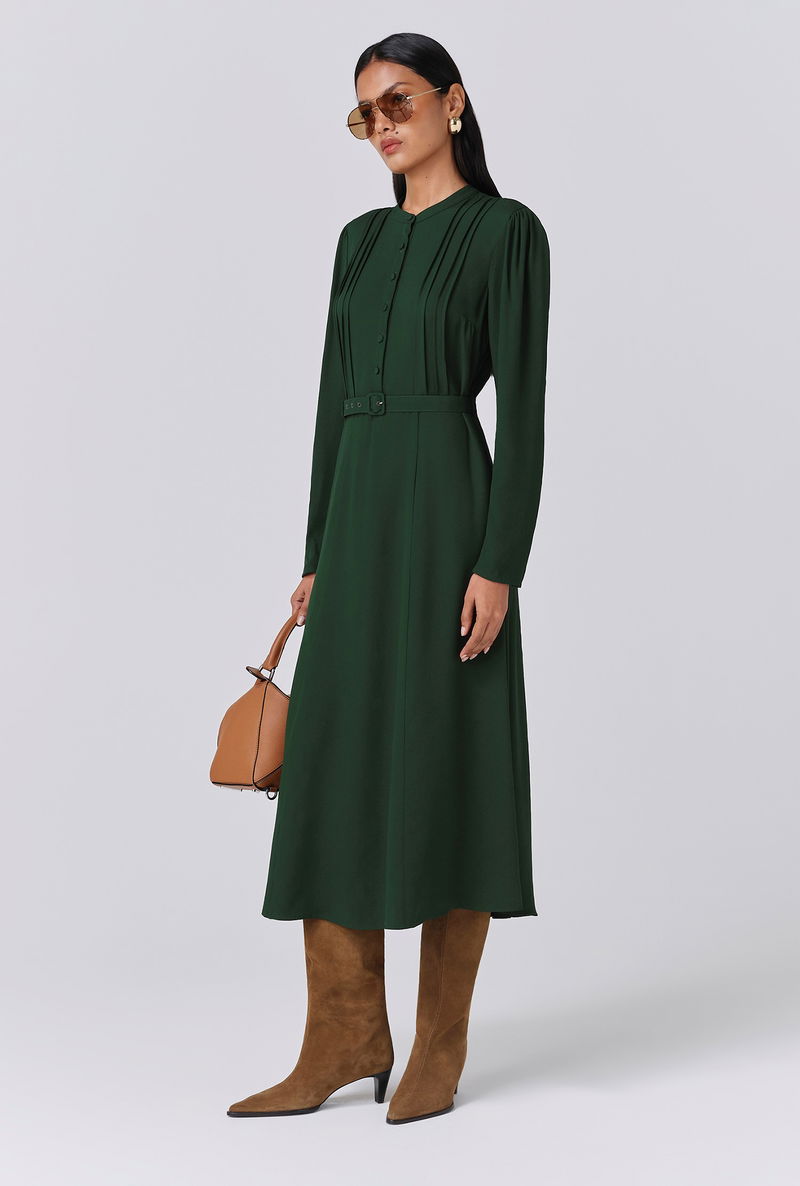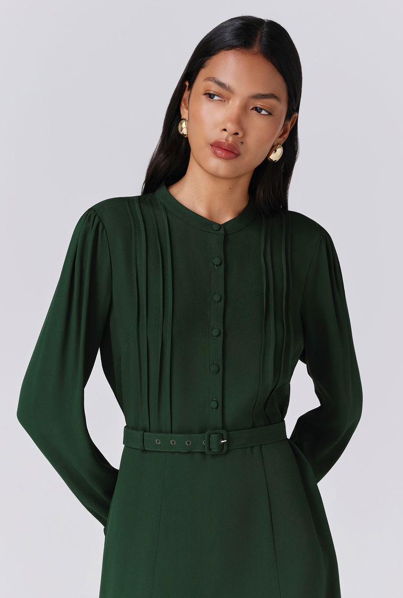 From pintuck detailing on the buttoned bodice to the slim self-covered belt that gently cinches the waist, every element has been added with simple elegance in mind. Crafted from crepe with a side seam zip fastening.