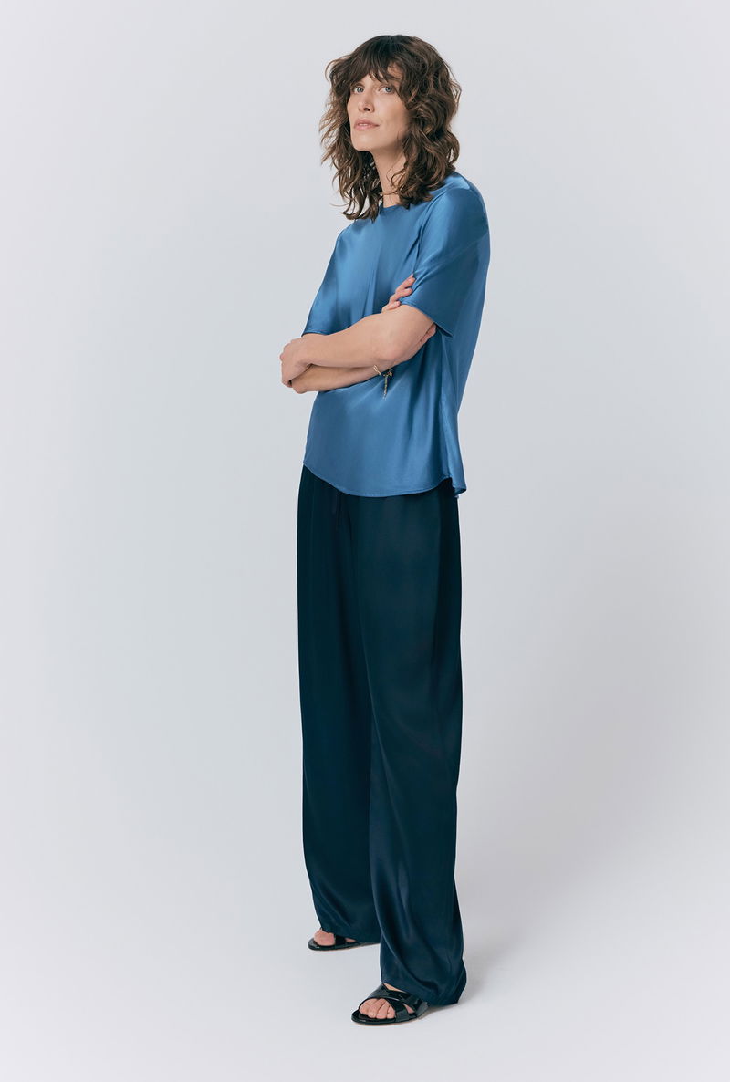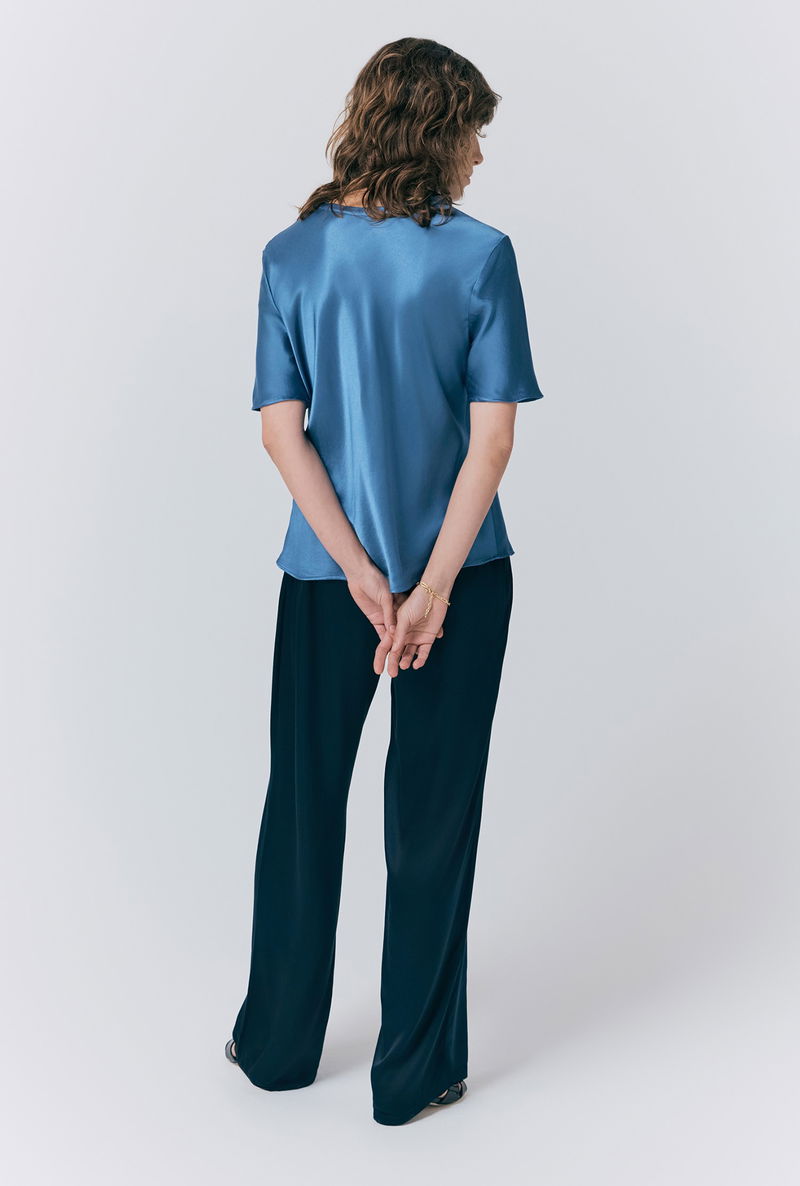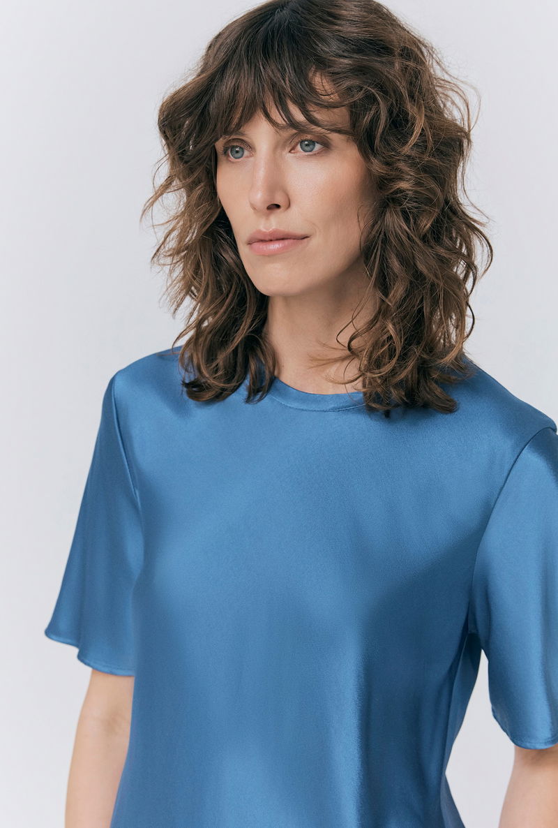 This Ivy blue satin top is crafted from the brand’s signature EcoVero satin fabric. Luxuriously soft and comfortable, Ivy features short sleeves and a round crew neck. Style with jeans, trousers, skirts or shorts – this versatile top is a wardrobe essential.