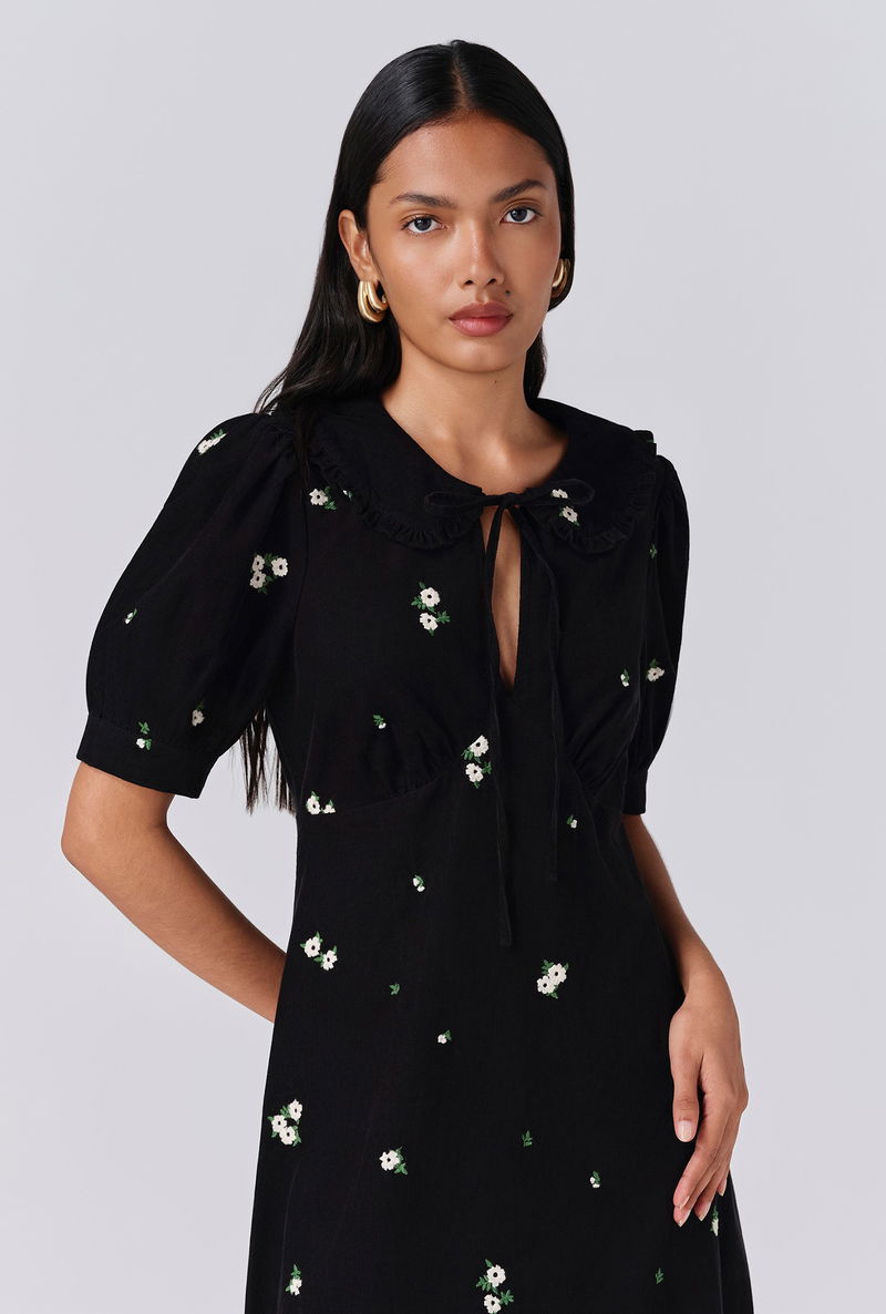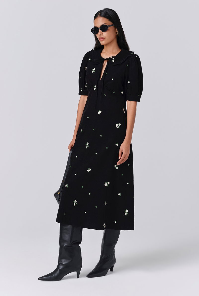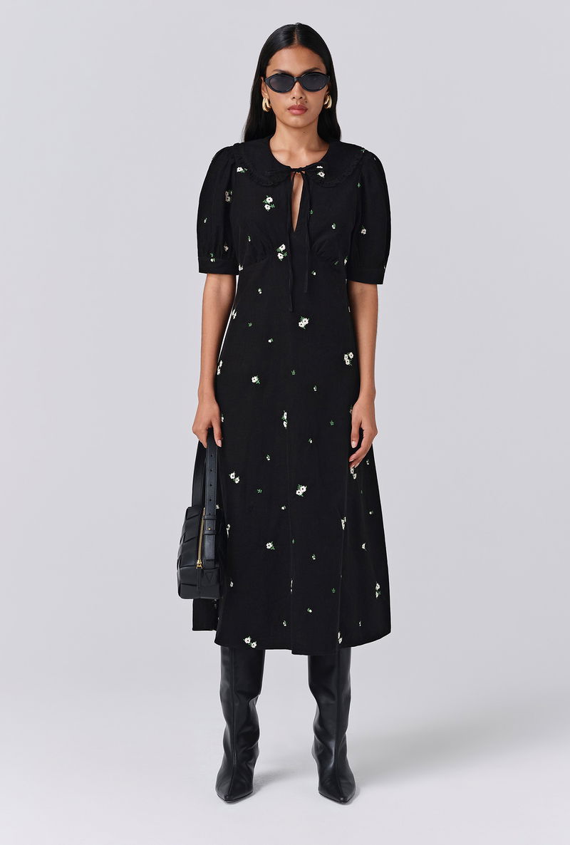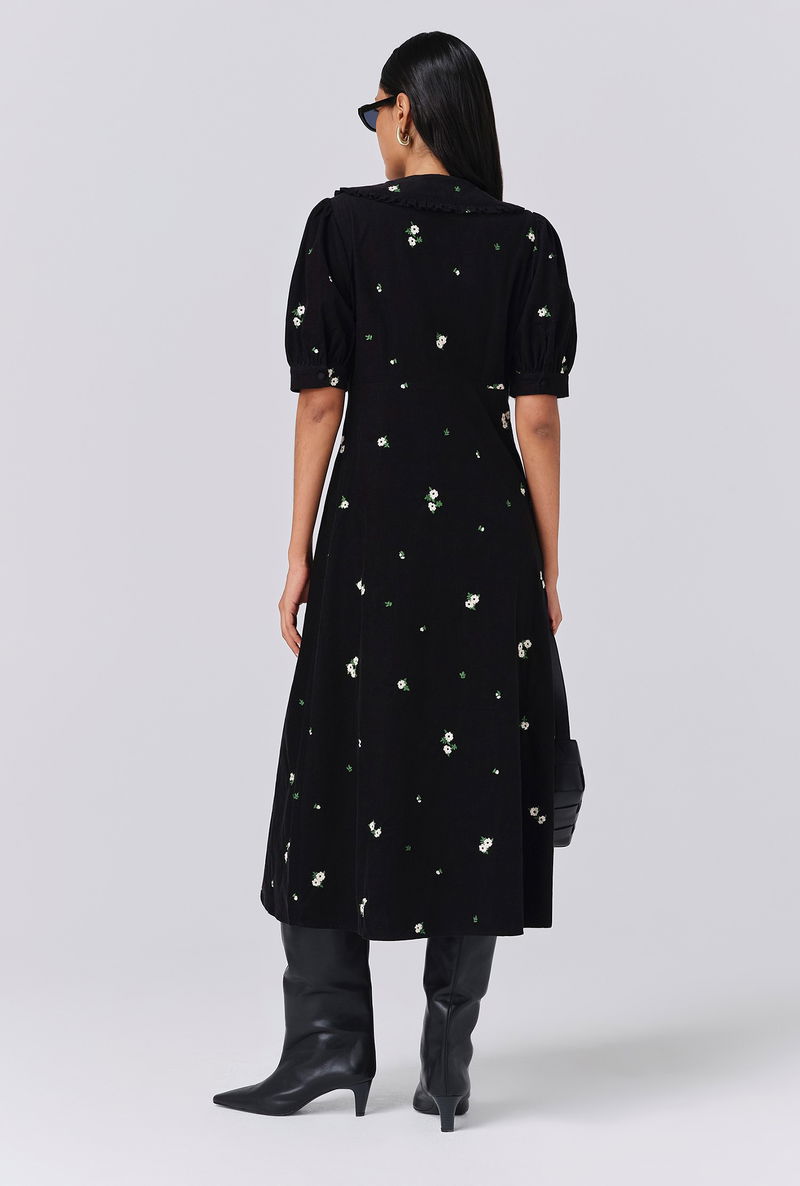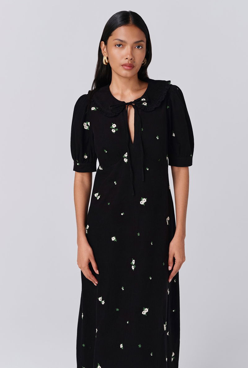 Welcome autumn with Juniper, a midi dress that makes the turning of the seasons all the more appealing. Made from corduroy for comforting weight, warmth and durability, there are countless reasons to love her. From the statement collar and neck tie to the peekaboo keyhole neckline, puff sleeves and floral embroidery dappled throughout, Juniper is a timeless piece that you’ll revisit year after year. Side seam zip fastening.