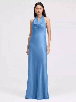 Strappy satin maxi dress with adjustable straps, under-bust seam for a fitted look, and cross-back detailing.