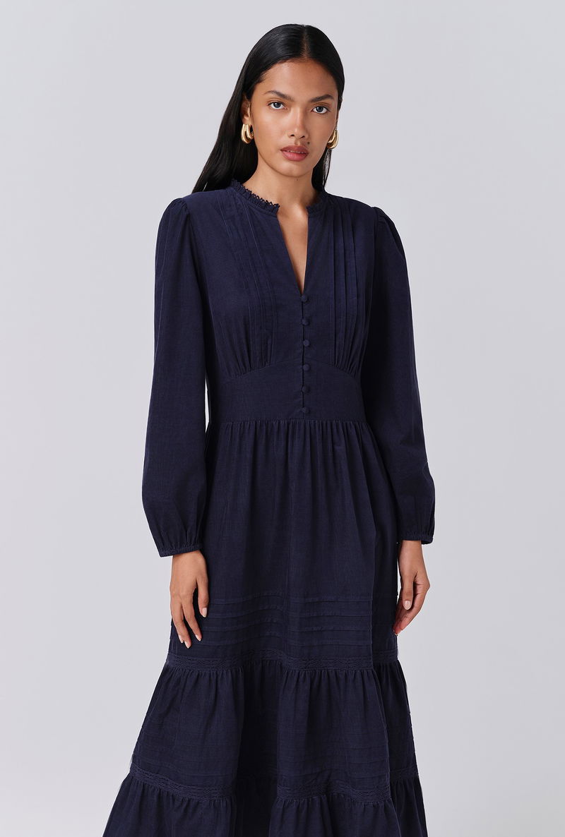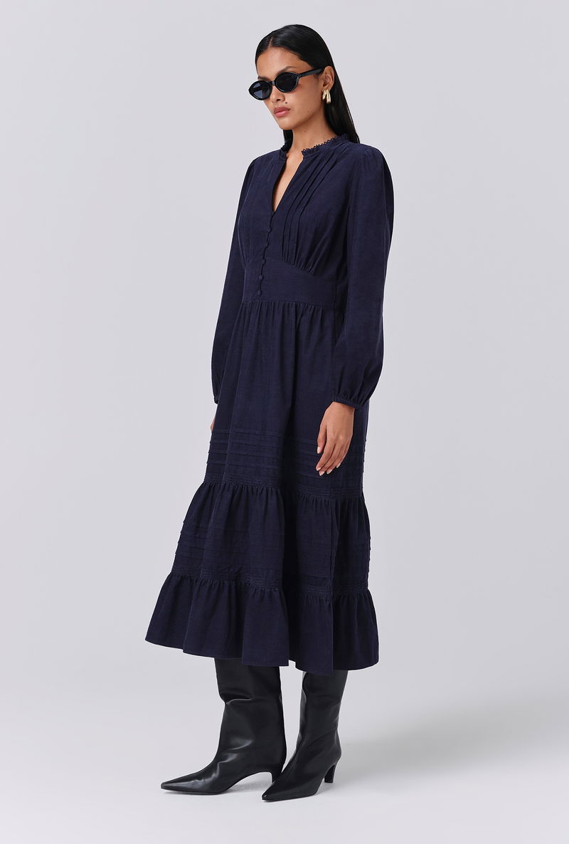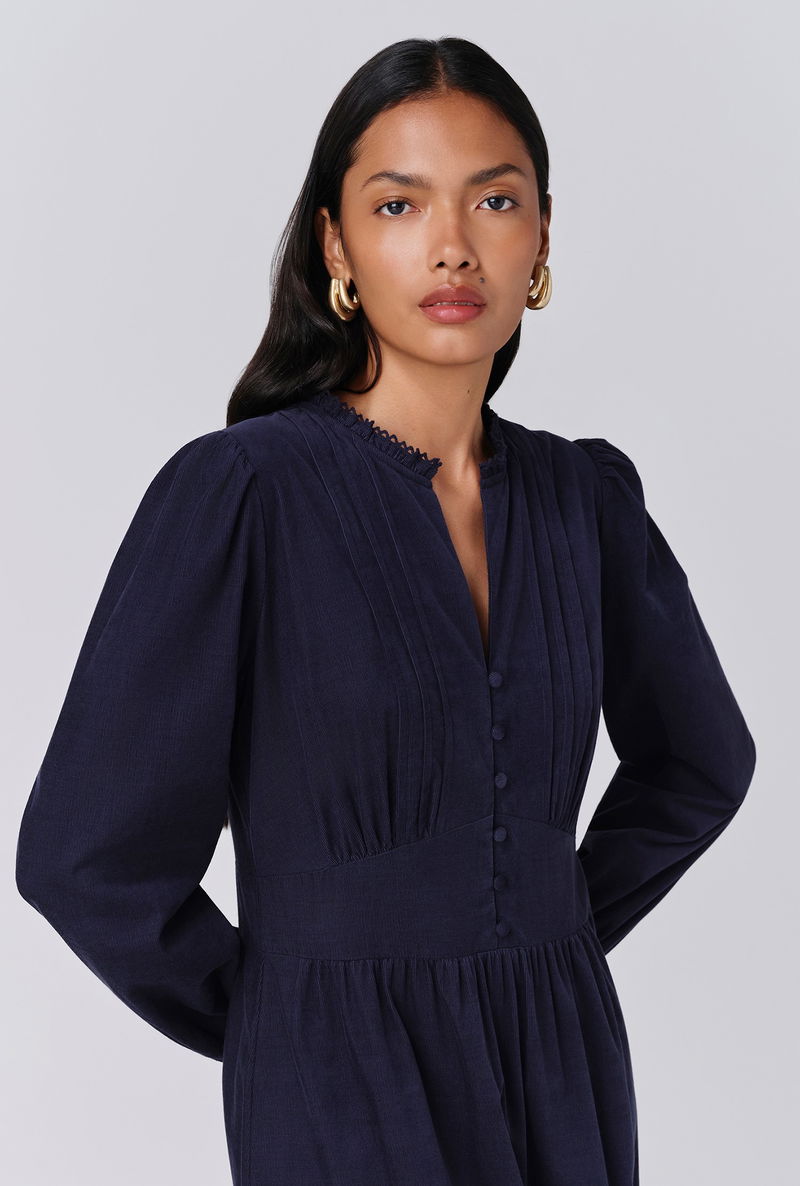 Ghost has long believed great design is all in the details, and Kamila is proof. Whether dressed up or down, this quietly sophisticated style speaks volumes thanks to its delicately frilled collar, bodice studded with covered buttons, tiered skirt and elegant pintuck and lace detailing. Crafted from corduroy for weight, warmth and durability, making it the perfect dress for the cooler seasons. Side seam zip fastening.