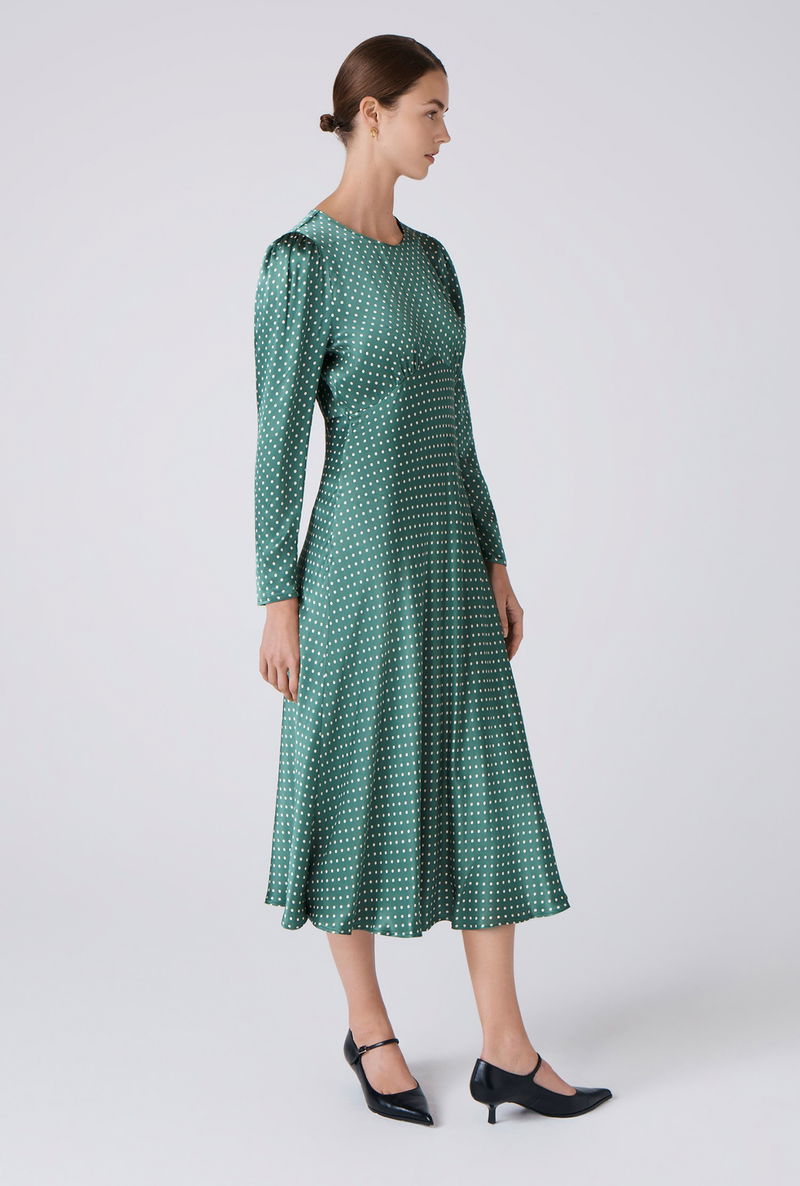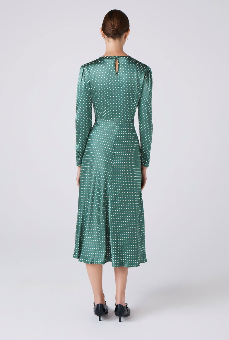 Simply sophisticated, Kiara is an understated midi dress that will become your go-to for special occasions and formal events. Made from soft crepe with a practical round neck, long sleeves with gently gathered shoulders and paneling at the waist to create shape. Keyhole and button at back neck and concealed side zip fastening.