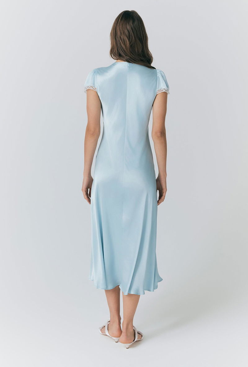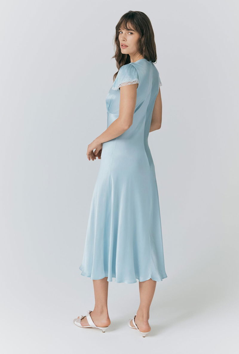 This is Lillie, a light blue bias-cut midi dress in viscose satin. The delicate cap sleeves and soft v-neck have lace trim for a luxurious feel, while the flattering empire line cut allows the fabric to skim the body. Just add minimalist sandals or heels for the ultimate in summer sophistication. What’s more, this v-neck satin and lace dress is available in an array of pastel colours making it the ultimate bridesmaid option.