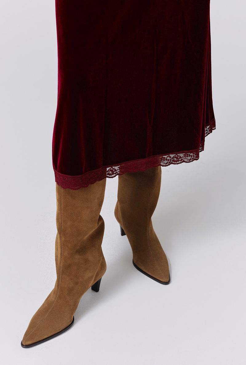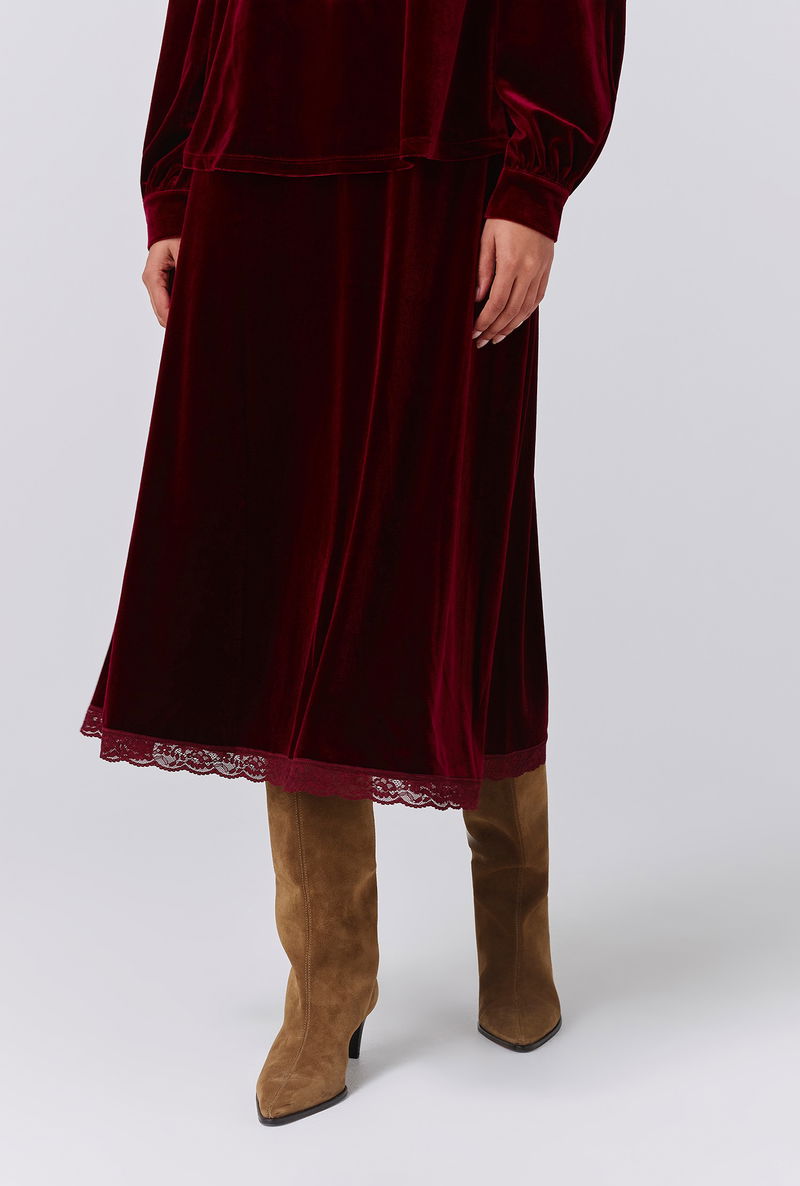 Comfort meets style in Lunette, a velvet jersey midi skirt with a practical elasticated waistband. Trimmed with delicate lace at the hem, it’s the perfect partner to our Athena top and an easy way to add an autumnal vibe to your wardrobe.