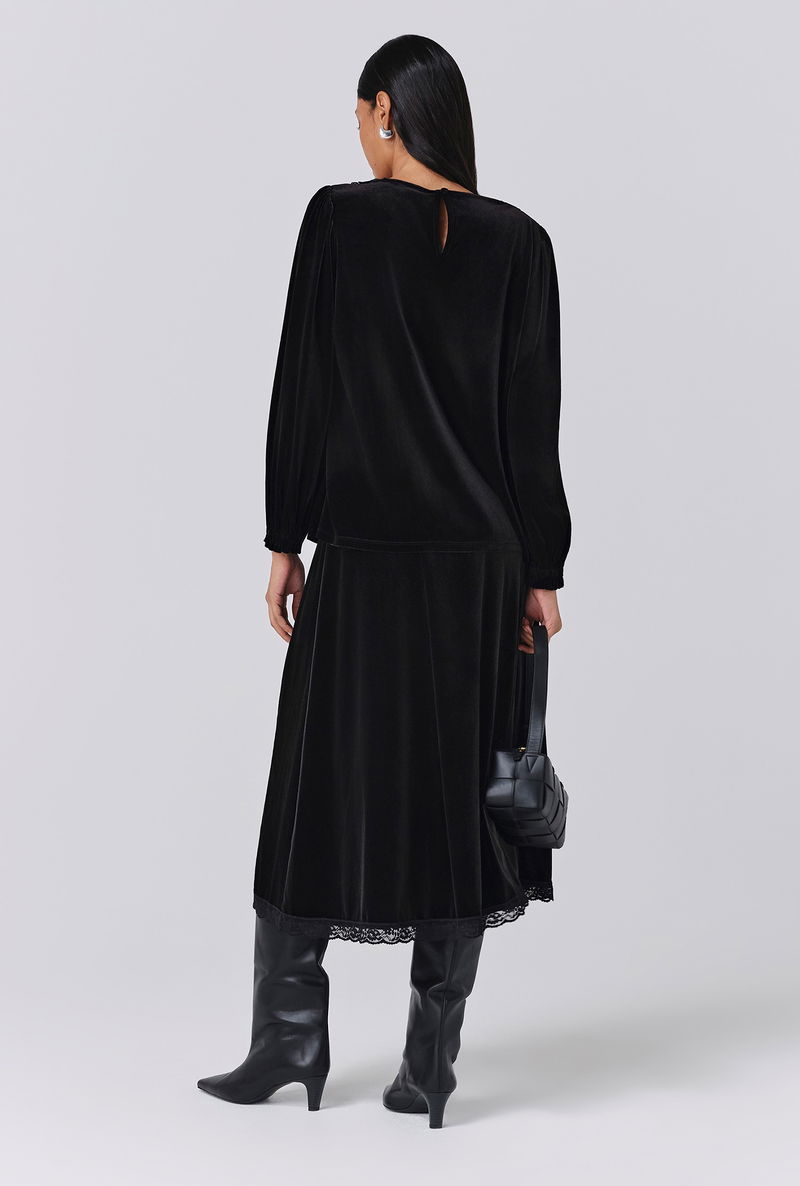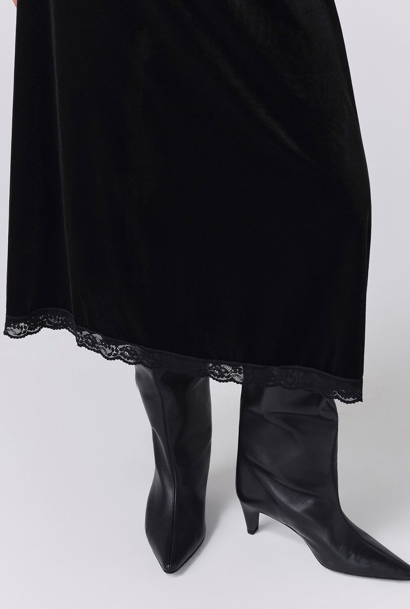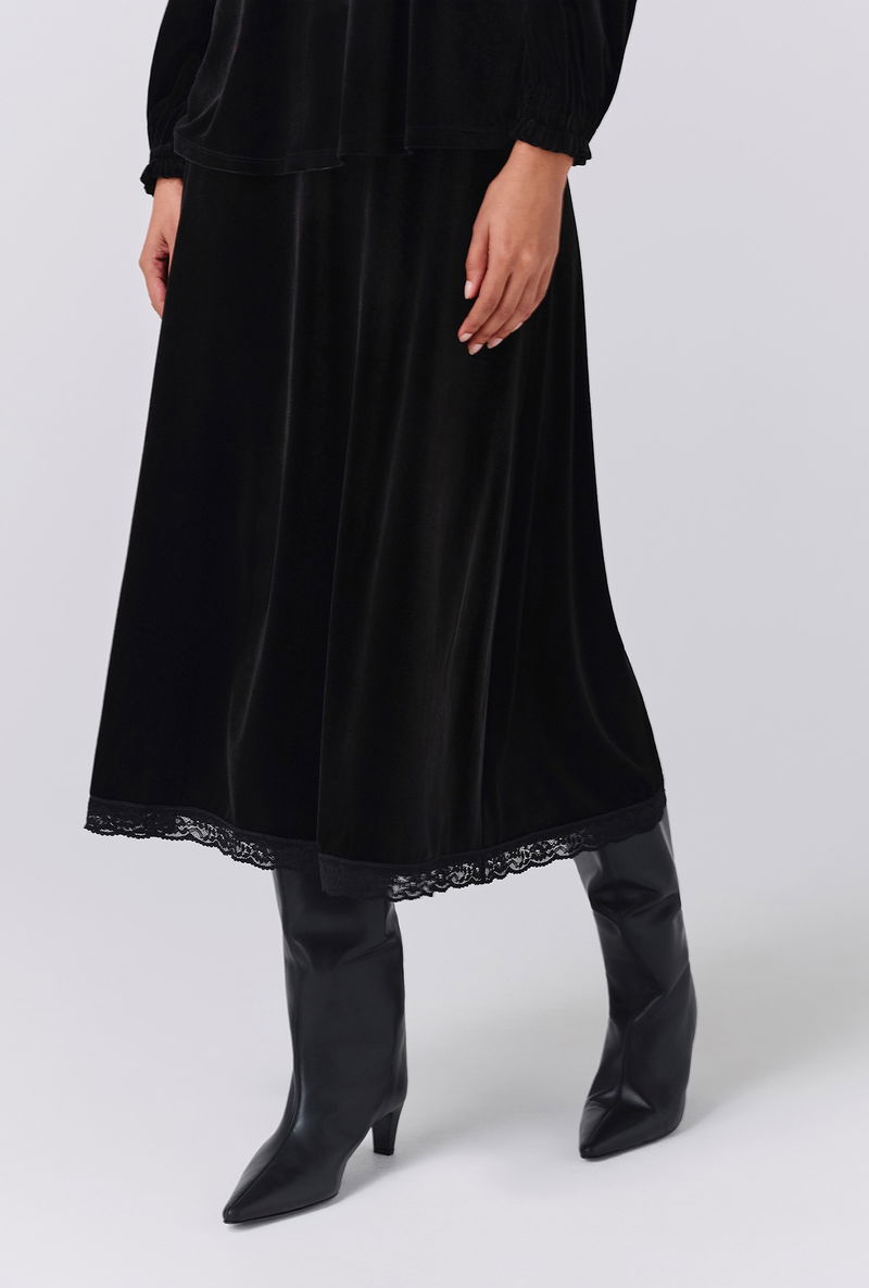 Comfort meets style in Lunette, a velvet jersey midi skirt with a practical elasticated waistband. Trimmed with delicate lace at the hem, it’s the perfect partner to our Athena top and an easy way to add an autumnal vibe to your wardrobe.