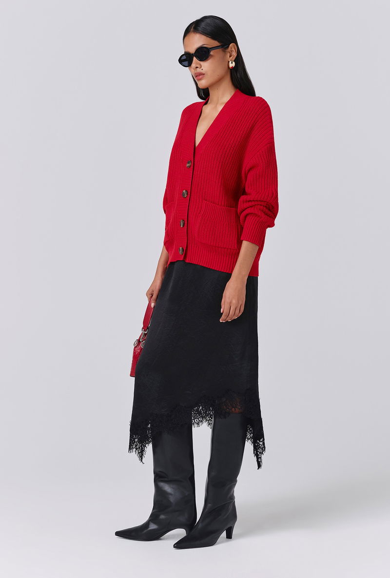 Freshen up your knitwear collection with Lyla, a classic v-neck rib-knit style made from 100% organic cotton. Complete with mock horn buttons, patch pockets and a ribbed hem and cuffs. We love it styled with a midi skirt and boots, but it looks just as good paired with off-duty denim.