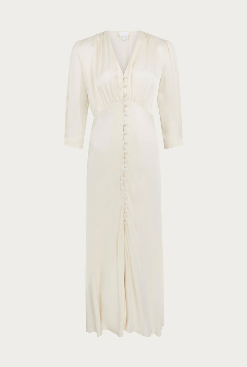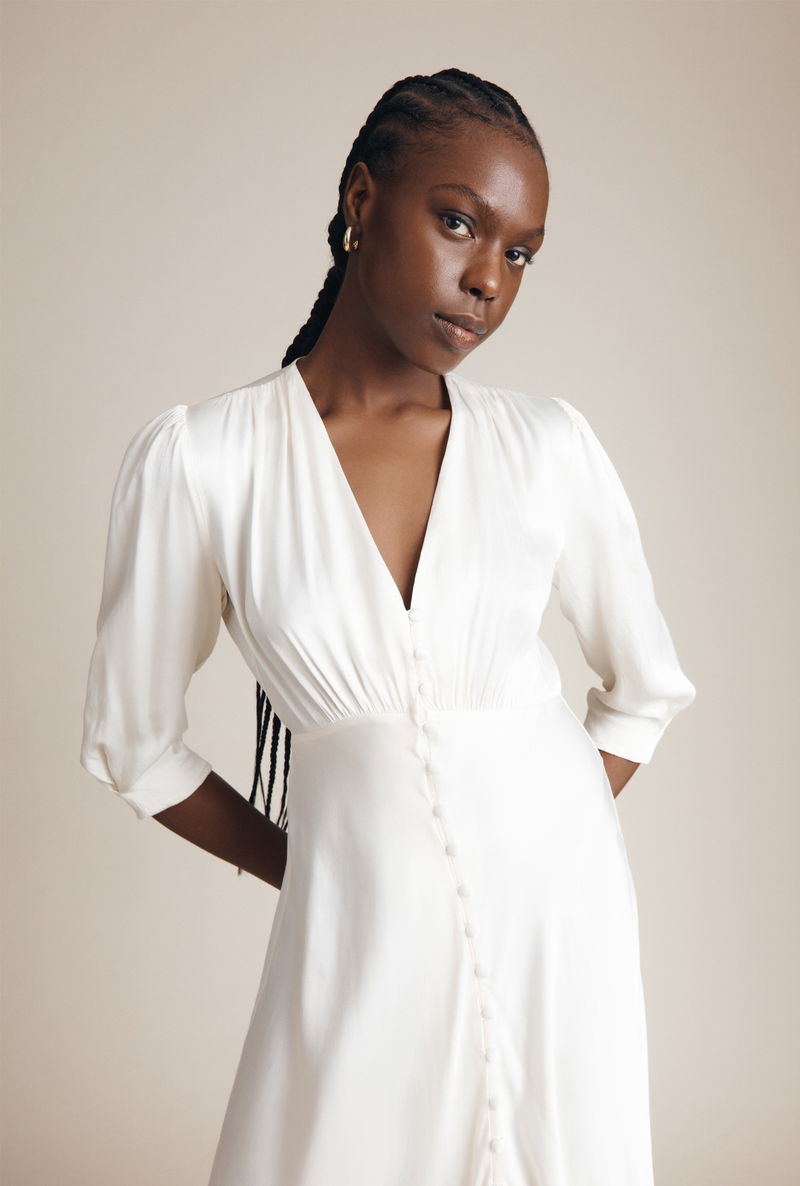 If you need a simple yet striking showstopper outfit, look no further than our Madison dress. Cut from sustainable EcoVero heavy satin, this vintage-inspired style features puffed shoulders, fabric covered buttons and three-quarter length sleeves. With a classic silhouette and front split detail, this ultra-feminine dress will endure season after season – plus it would also make the perfect bridesmaid’s dress.