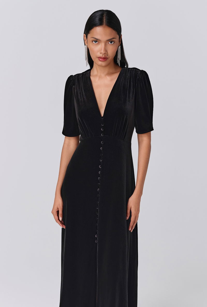 Make event dressing a breeze with Madison in velvet jersey, a seasonal take on a much-loved style. A vintage-inspired v-neck midi dress with gently puffed short sleeves and a button-through front. A versatile piece that will endure season after season, and see you through years of festivities with ease.