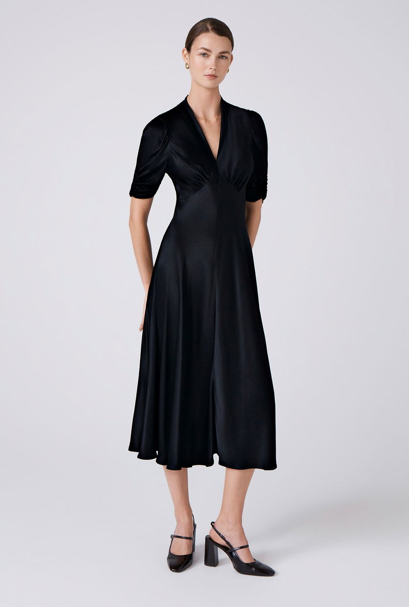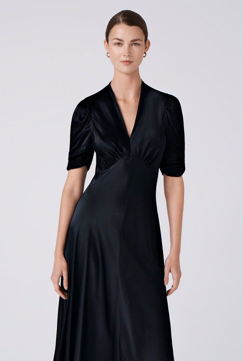 Taking inspiration from the classic tea dress, Mia is a midi-length style in our signature satin fabric. Cut on the bias for a universally flattering fit with a v neckline and elbow-length sleeves that are gently gathered to create volume at the shoulder, it’s the perfect piece to take you to all manner of occasions - just accessorise to suit.