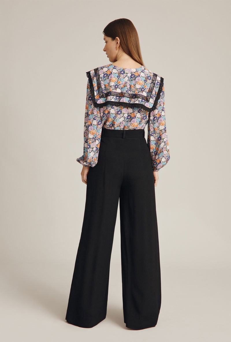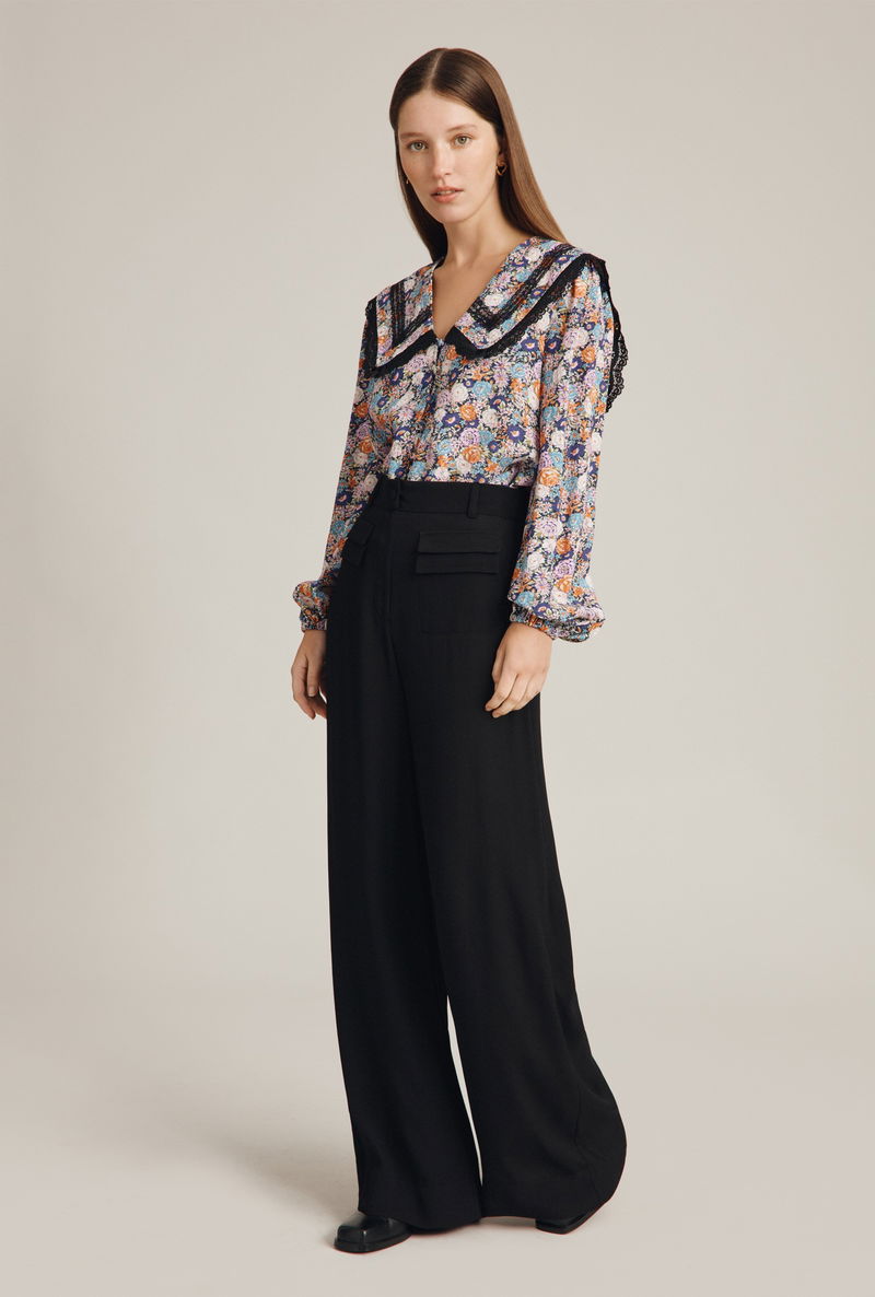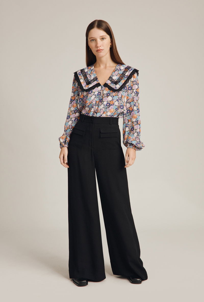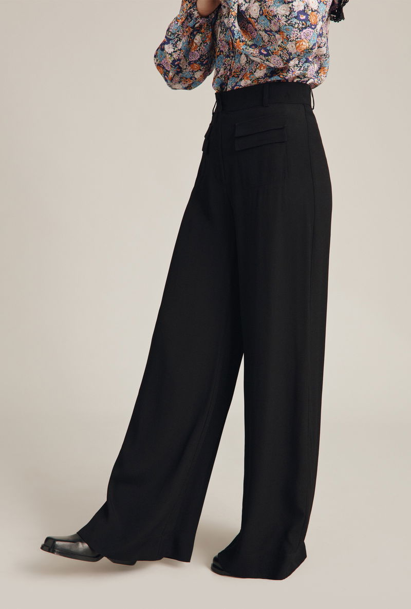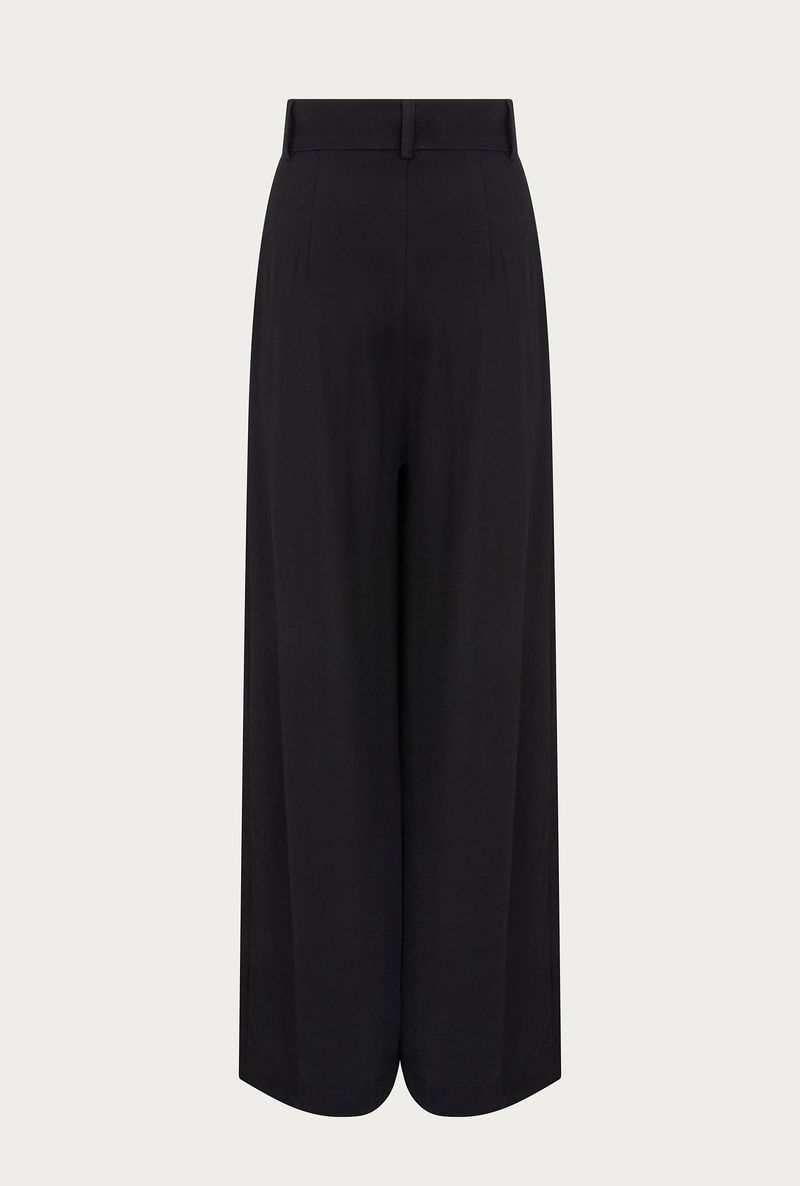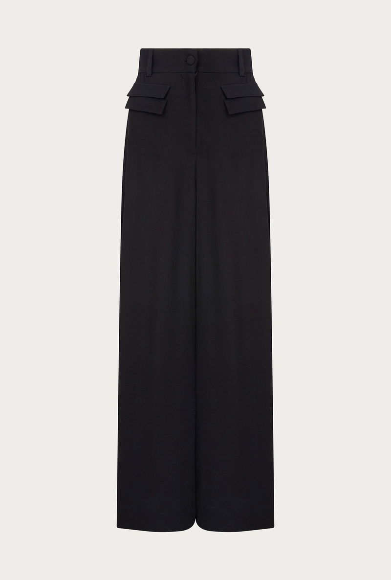 For flattering trousers that will take you from day to night with ease look no further than Mya. Made from our signature satin back crepe in black, these wide-leg trousers feature a fixed waistband with button detail. There is also a stylish patch pocket at the front, with the look of a double flap pocket. Great for colder days when you want a little extra coverage, they perfectly combine comfort with style.