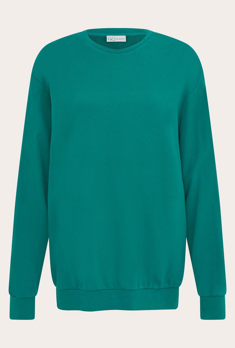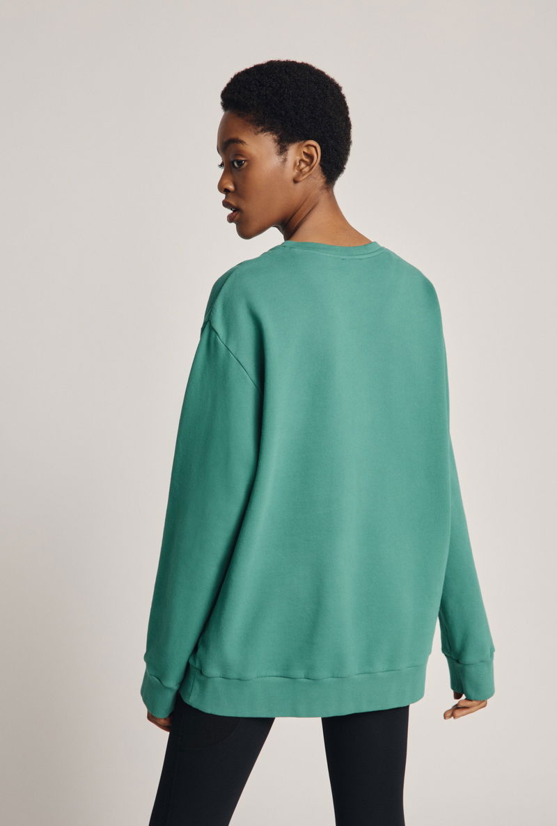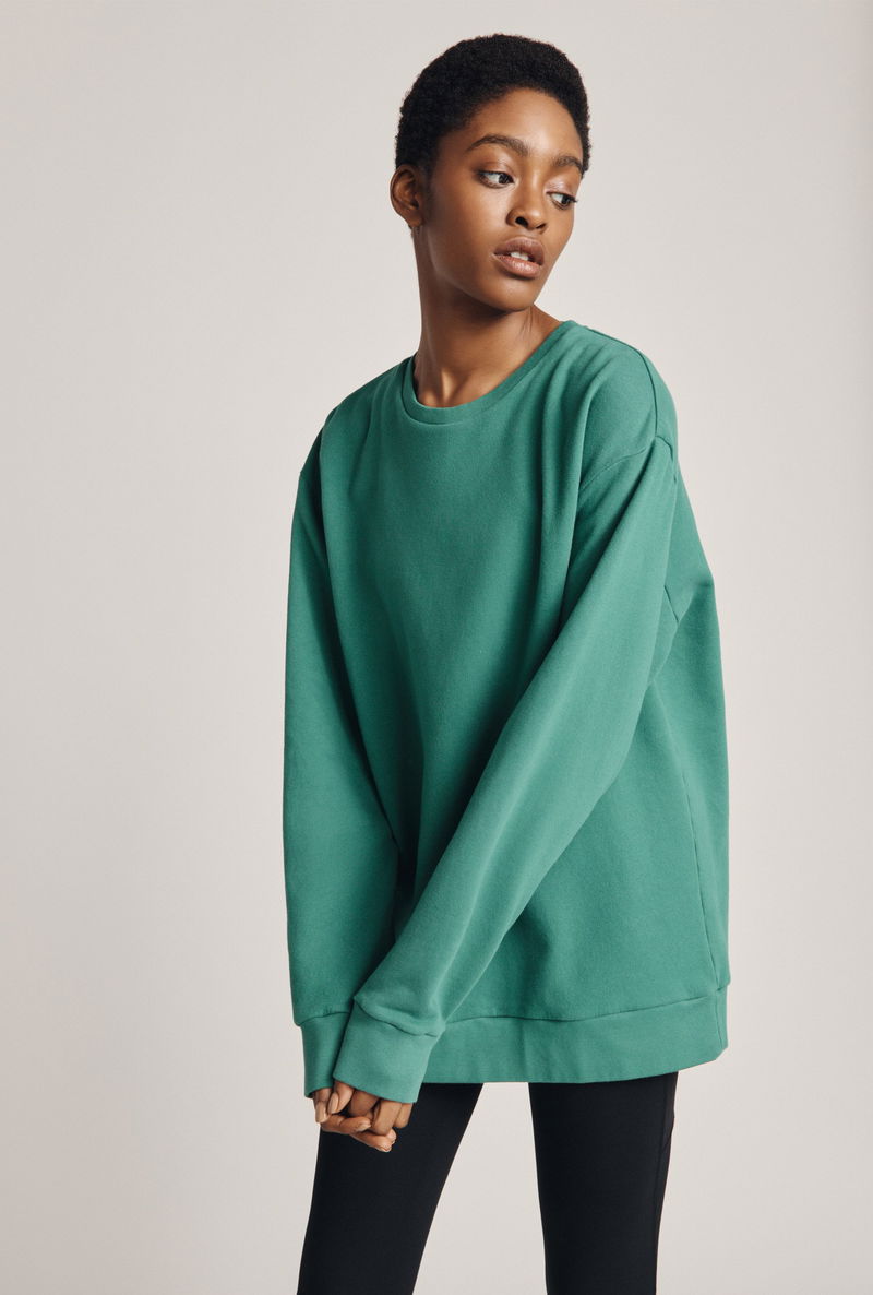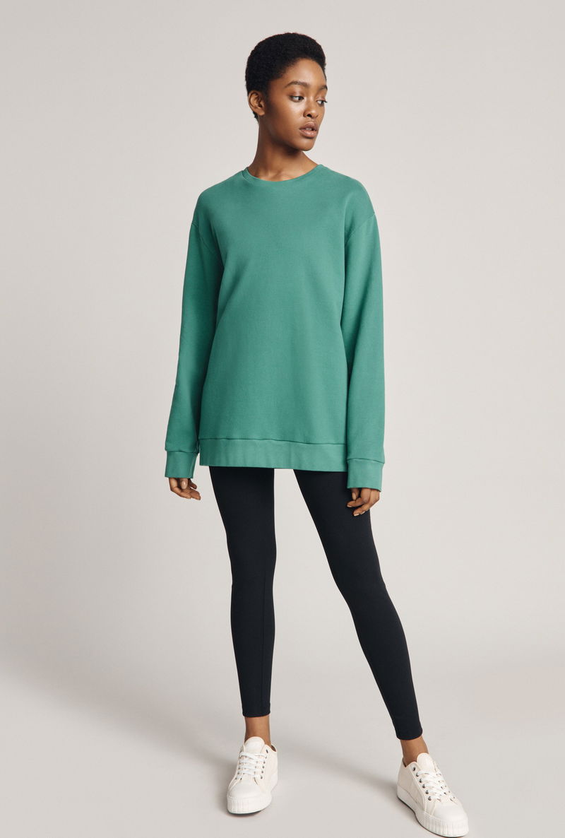 Featuring a classic sweatshirt crew neckline, our dark green longline sweat is made from breathable loopback jersey fabric and oversized to withstand the most flexible of workouts. Featuring a deep ribbed hem and cuffs this simple sweatshirt will match perfectly with any leggings of your choosing. Whether you’re hitting a workout class or running errands, this casual-wear sweat is a wardrobe must-have.