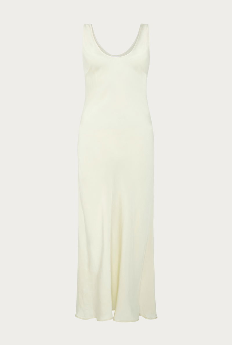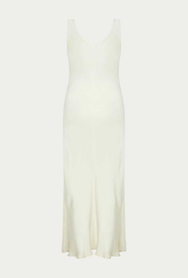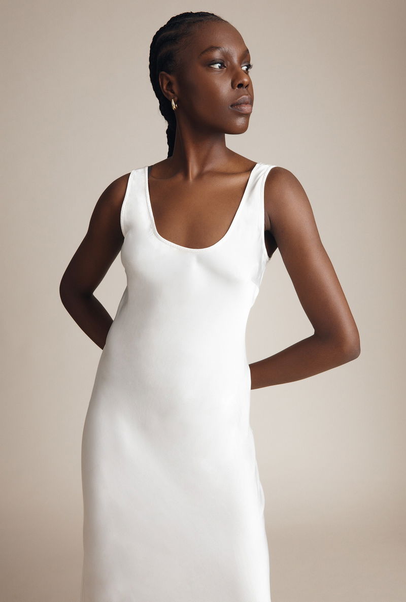 Less is most definitely more with our bias-cut satin slip Palm dress in ivory. A wear-anywhere, any-season classic, this beautifully simple dress is both stylish and elegant. Featuring thick straps, a scoop neckline and flattering midi length, pair Palm with heels and a statement clutch for dressier occasions, or layer over a white t-shirt and pair with sneakers for a more casual look.