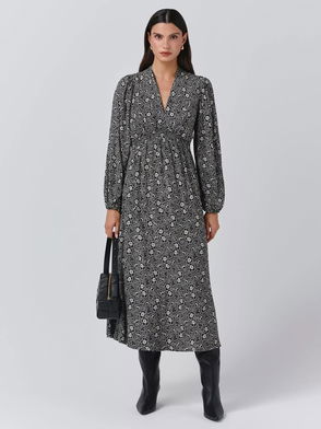 Petal is a versatile midi dress that will become an invaluable piece in your wardrobe. Crafted from fluid viscose, this midi-length dress has a deep V neck and a comfortable shirred waist with tie detailing at the back for a semi-fitted silhouette. The 3⁄4 sleeves with elasticated cuffs add subtle volume. Dress her up for special occasions or style with flats for a chic daytime look.