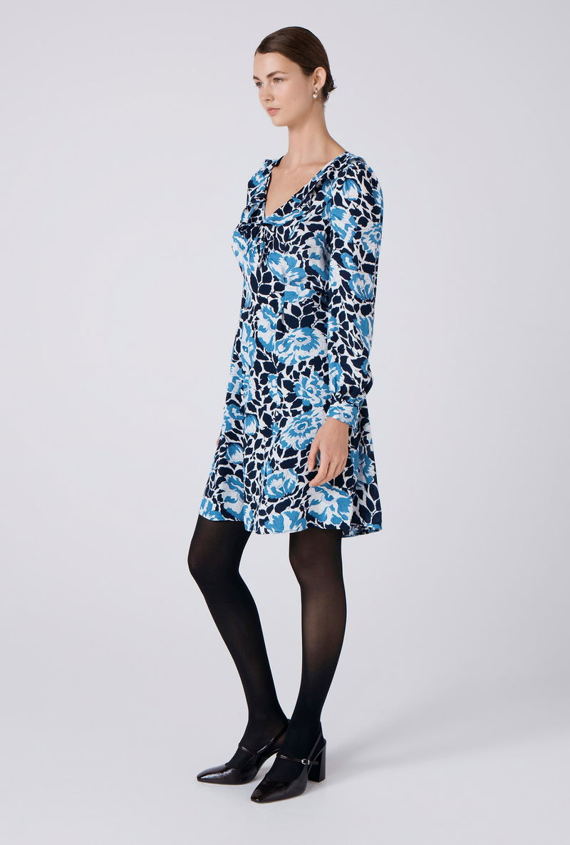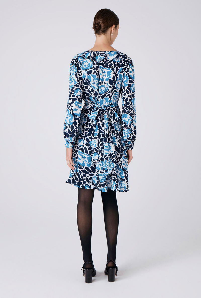 Short and sweet, Remi is a mini dress infused with gentle romance. Crafted from crepe, it features a frill-trimmed v neckline with a front centre tie and long sleeves with buttoned cuffs. Cut to emphasise the waist with a tie belt, the skirt falls into a gently flared A-line silhouette and hits above the knee, making it perfect for more casual occasions.