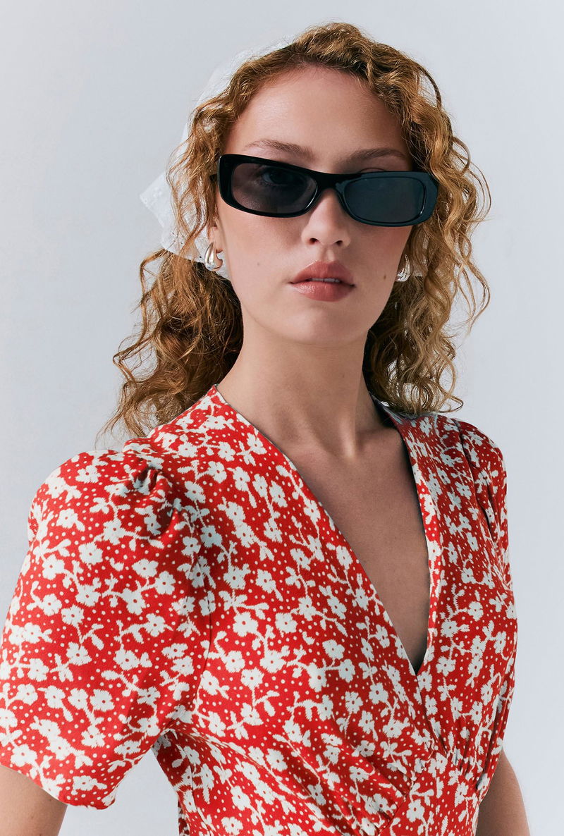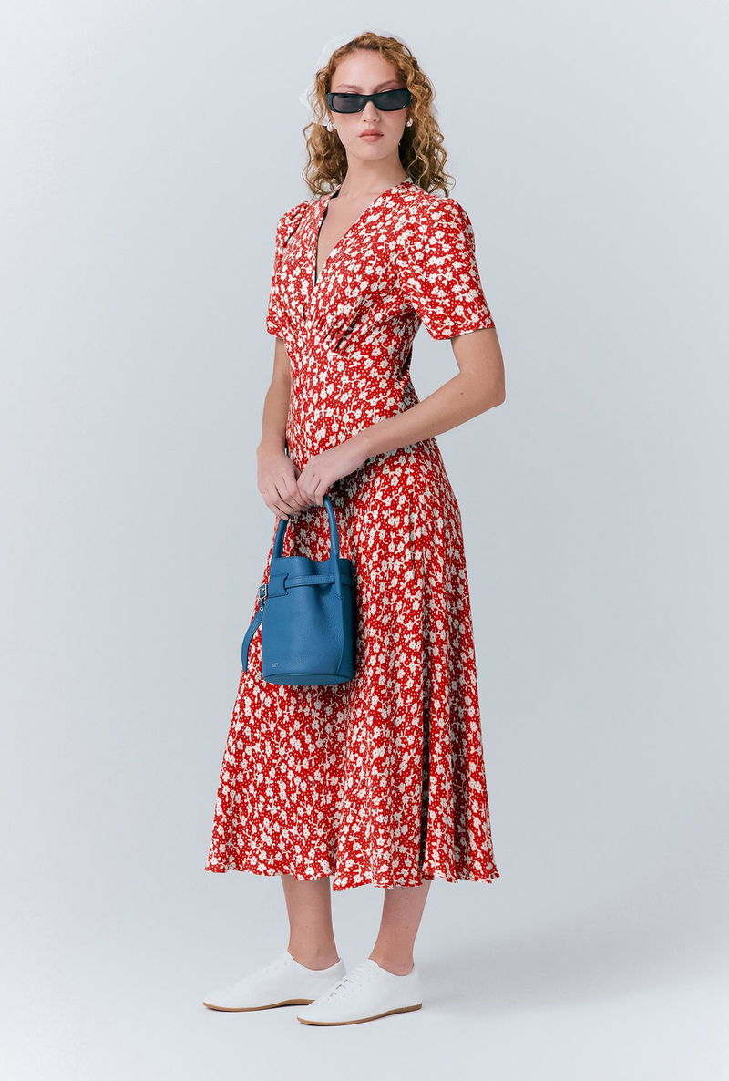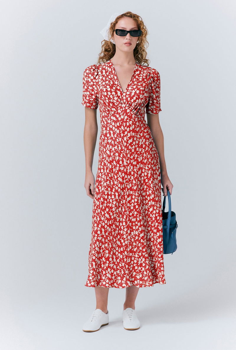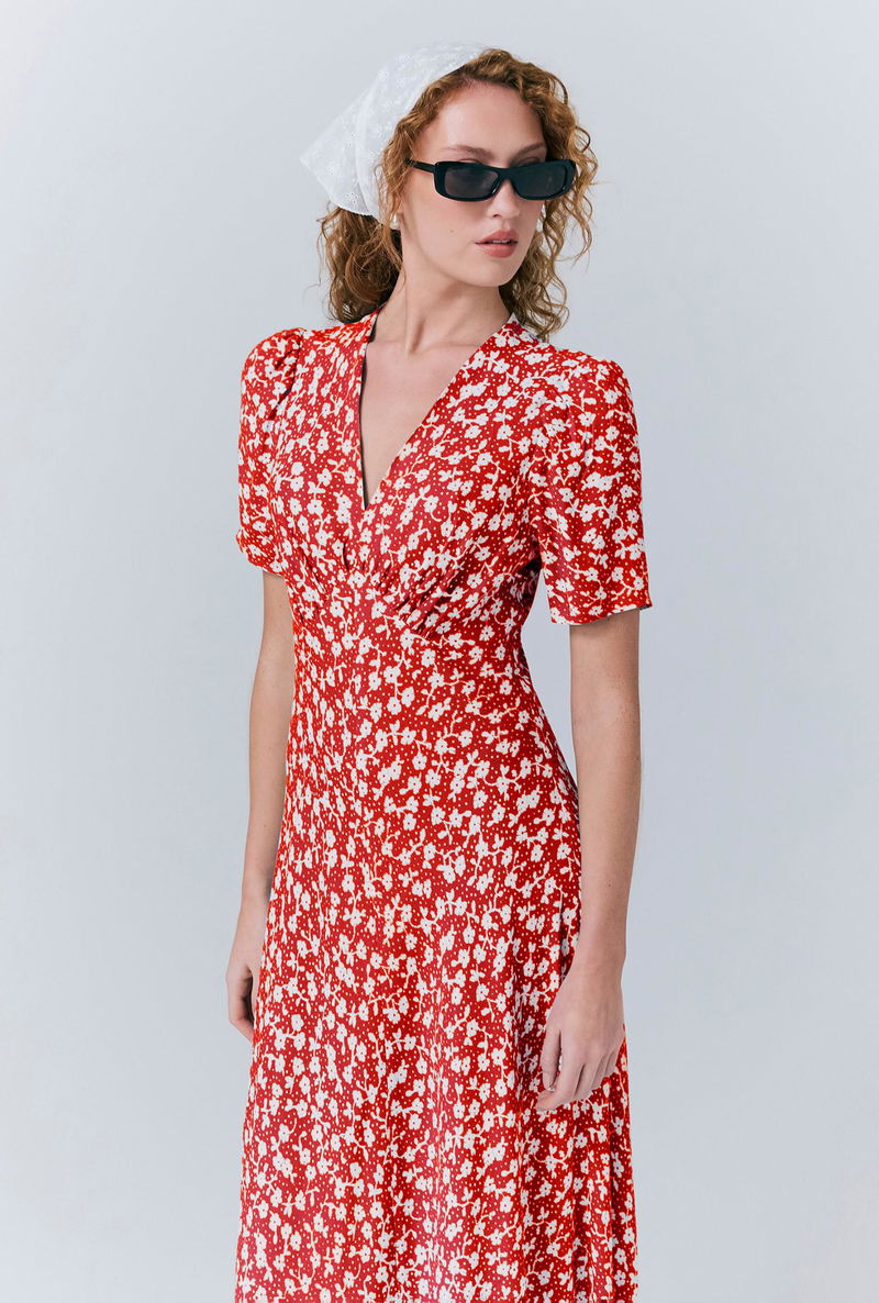 If you invest in one dress this season, make it Roxanne, a versatile red floral midi tea dress that’s inspired by the classic style. Featuring a v-neck, panelled empire waist seam, short puff sleeves and a bias cut skirt, every inch of this dress is designed to flatter while being comfortably practical. Wear with everything from fresh white trainers to sandals and heels and let Roxanne take you anywhere you want to go this season with ease.