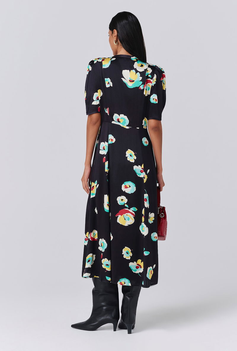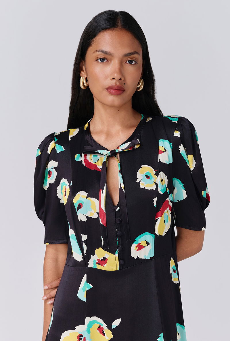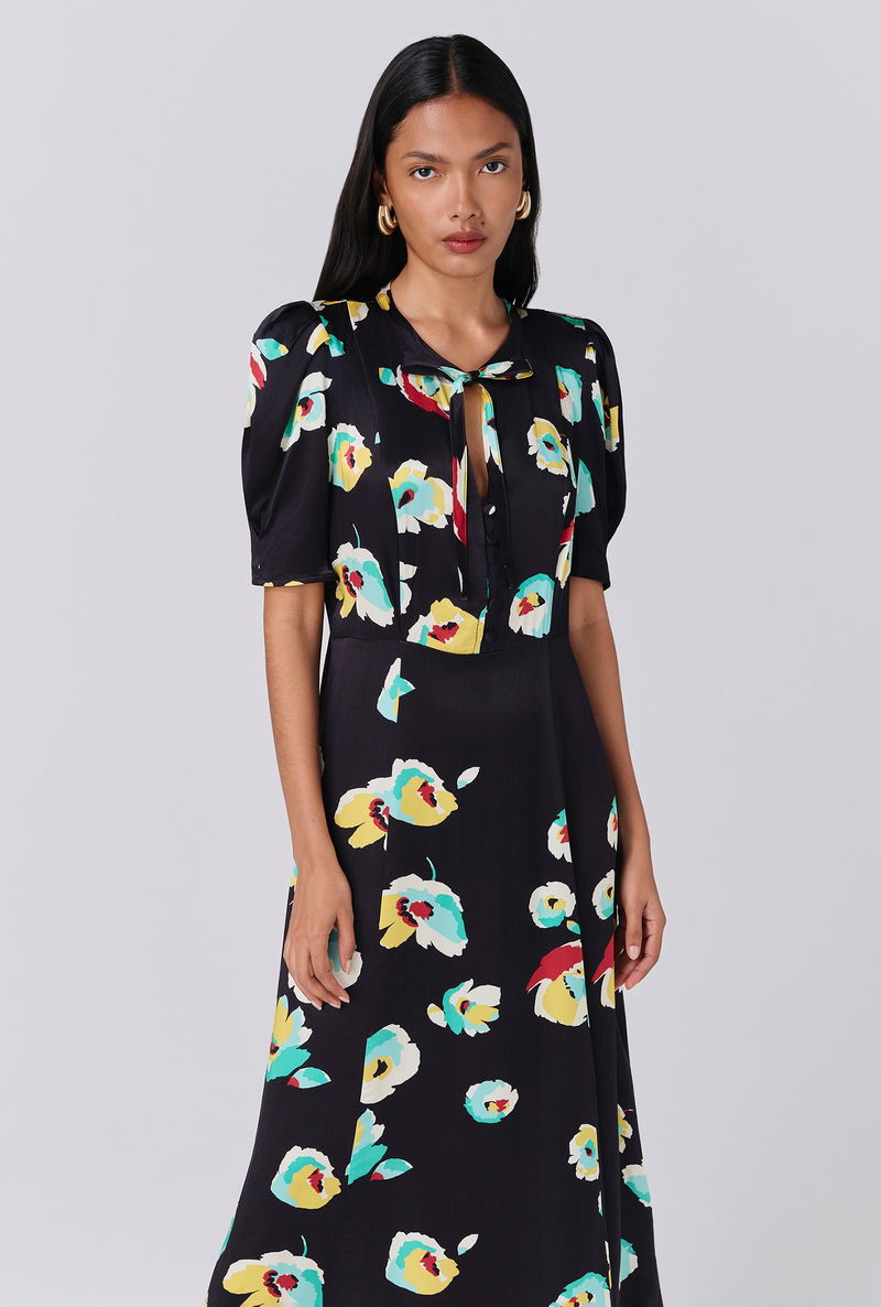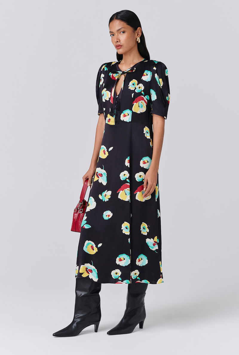 Winter florals you’ll want to wear all year round. Savannah is a versatile midi dress with a timeless, feminine silhouette. Crafted from our signature satin fabric, it features a round neck with front tie, covered button detail at the bust and short voluminous sleeves. Style with long boots and a colour-pop accessory. Concealed side zip fastening.