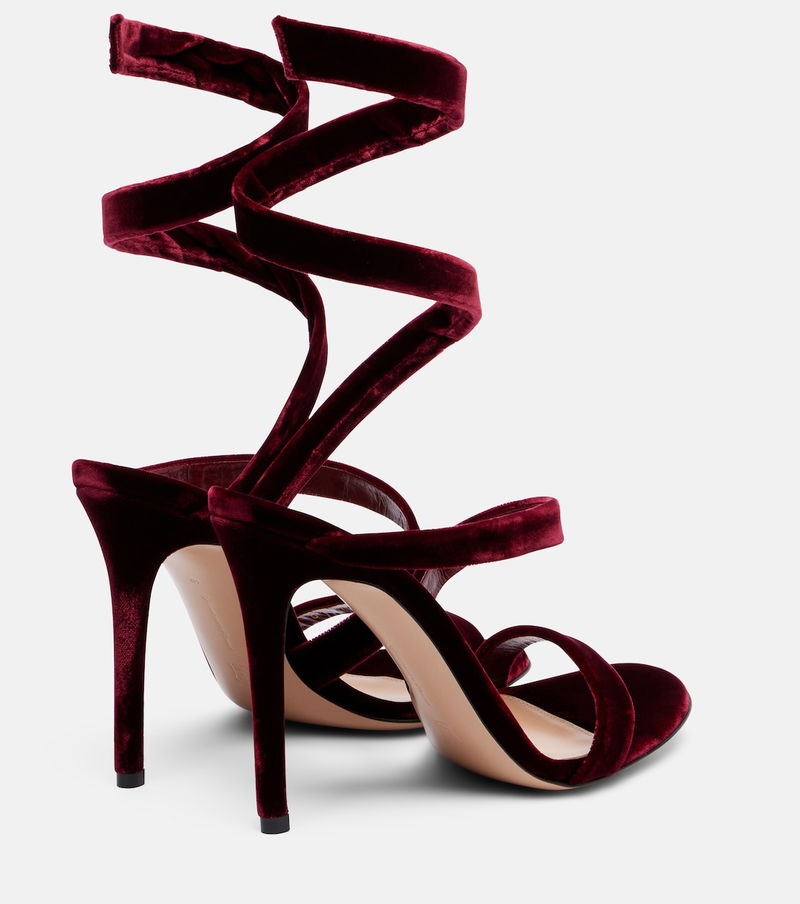 The Opera sandals from Gianvito Rossi are crafted in Italy from soft velvet and sit atop 105mm heels. The pair features round open toes and straps that gracefully wrap around the legs for a glamorous finish.