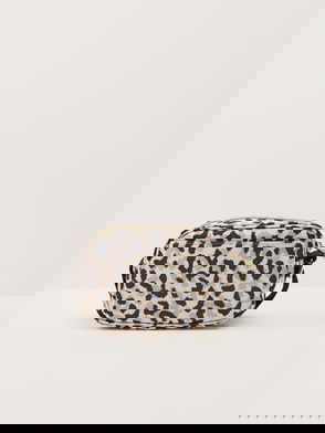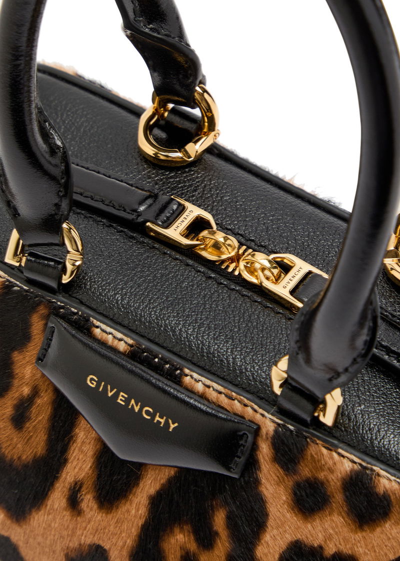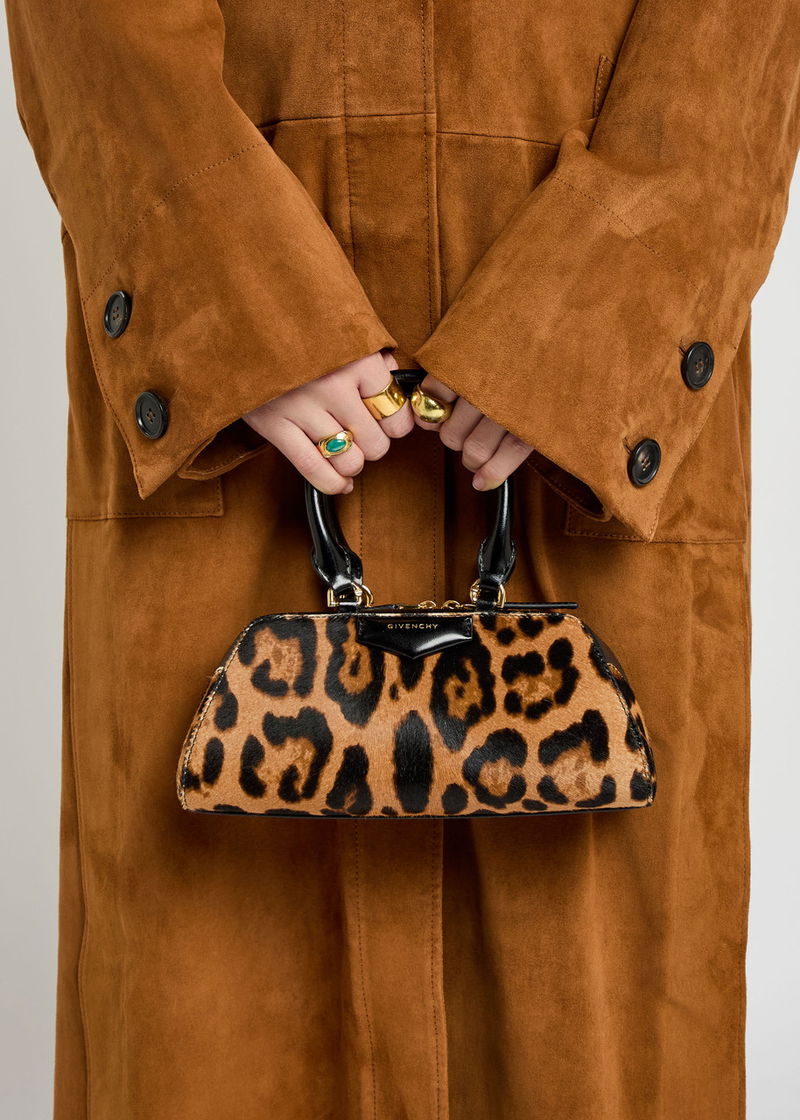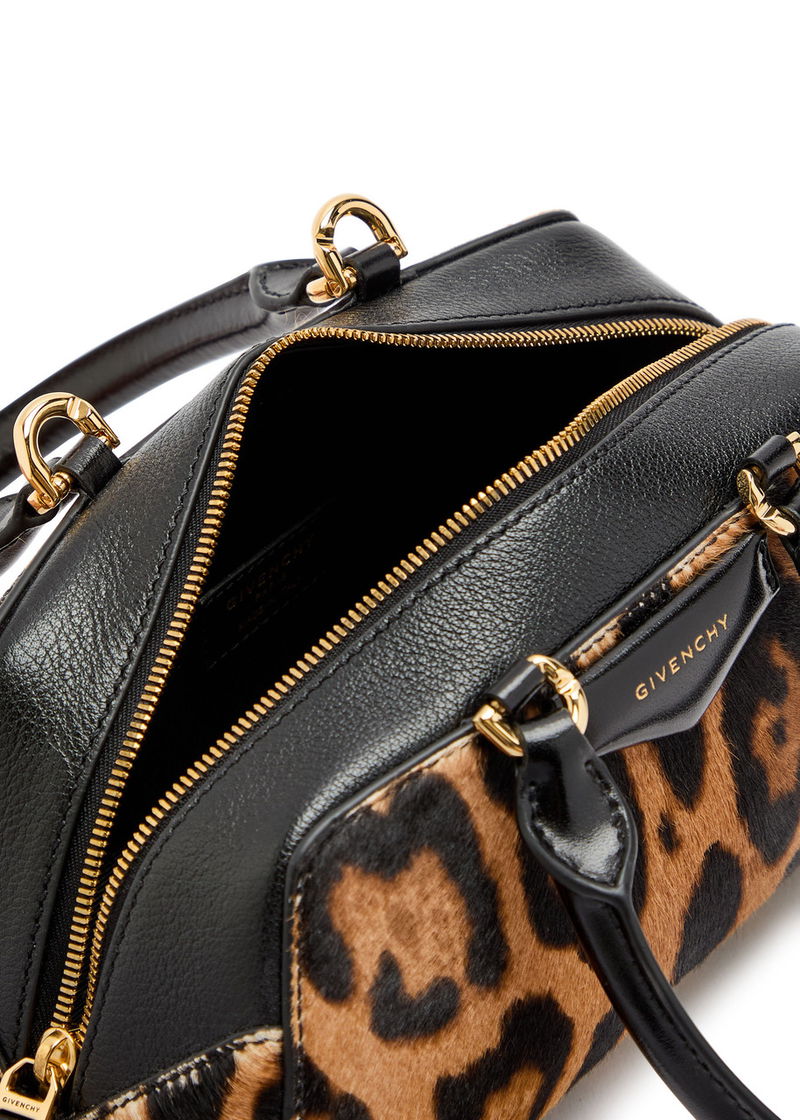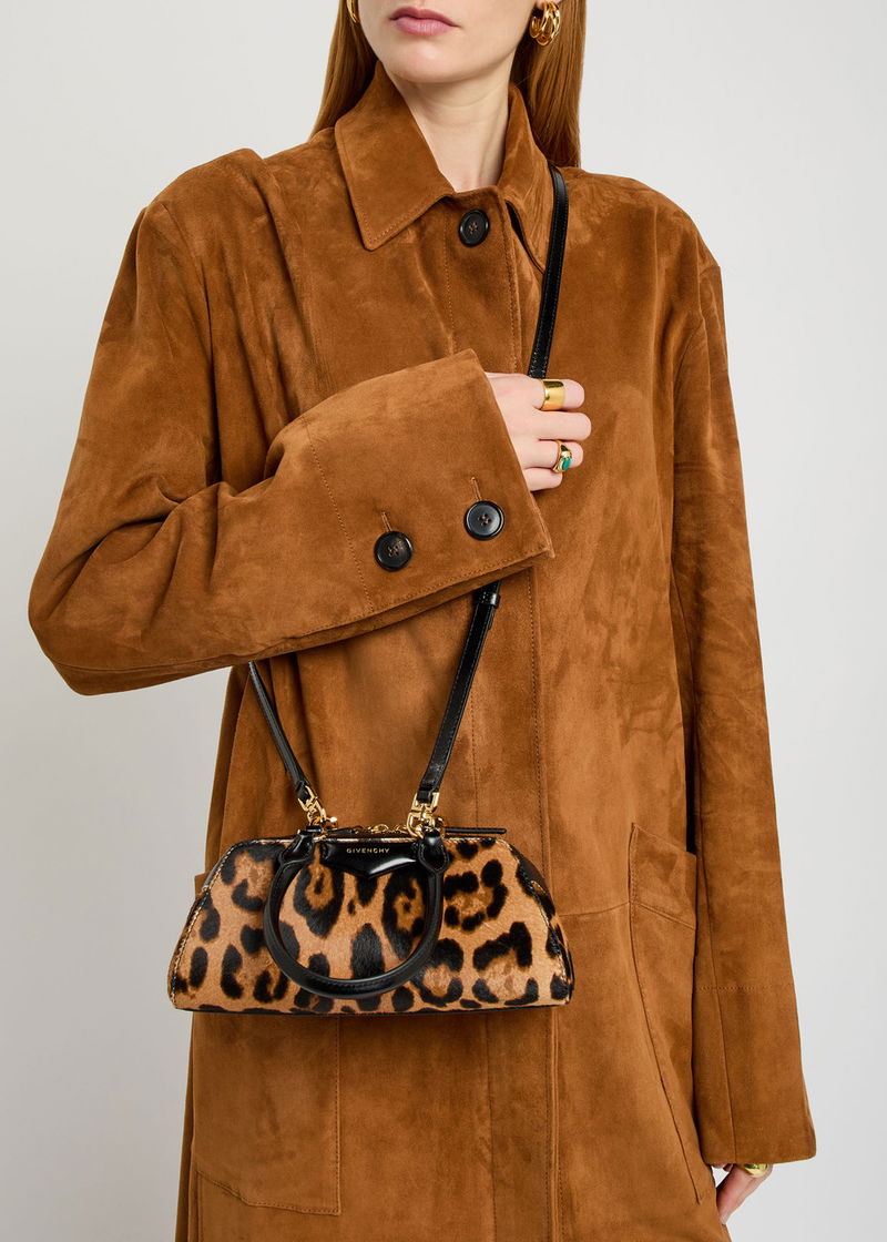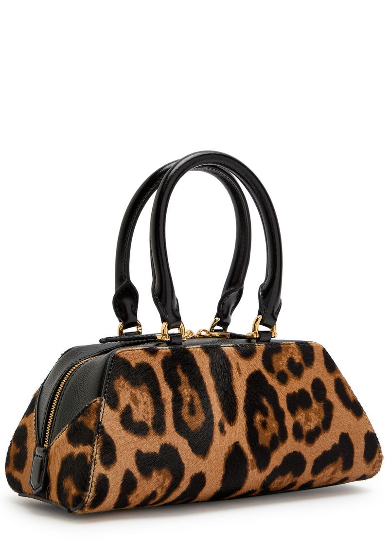Two top handles, detachable adjustable shoulder strap, leopard print calf hair, designer plaque, designer-engraved hardware, fully lined.