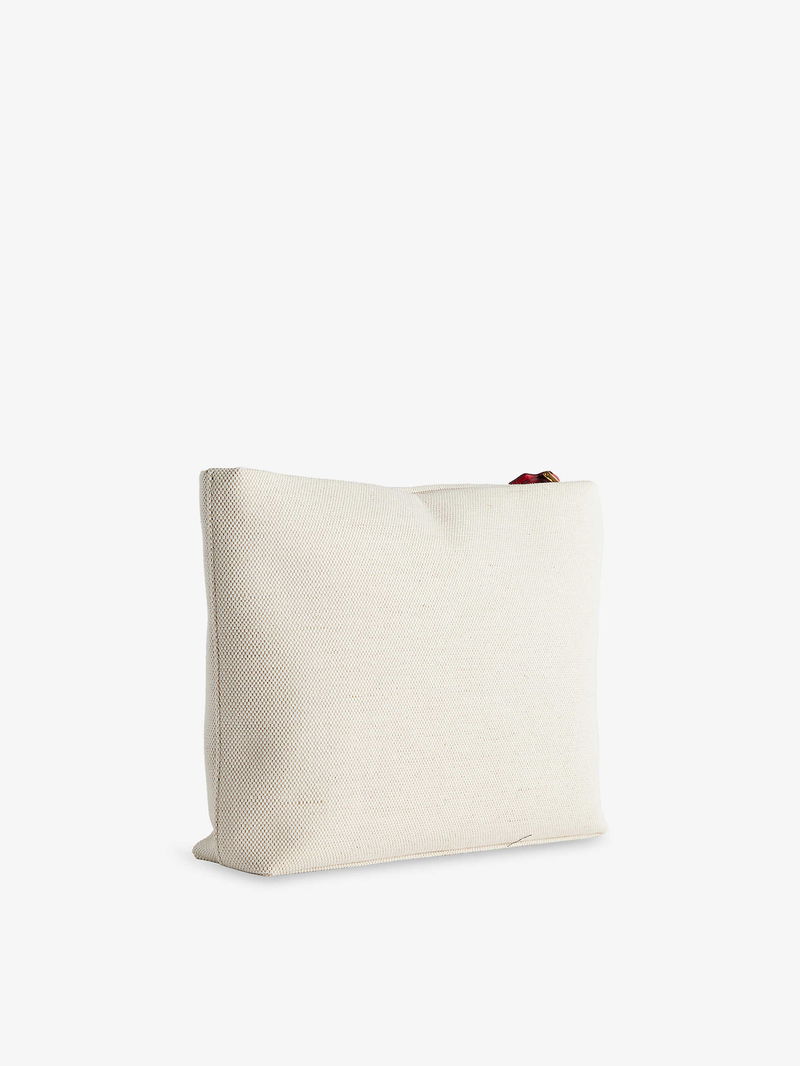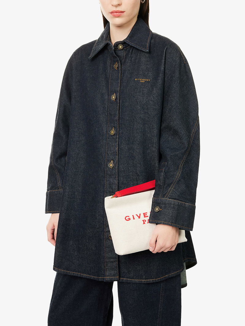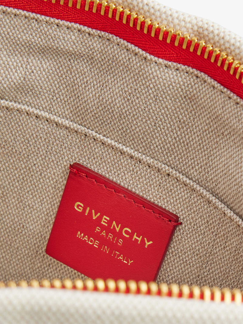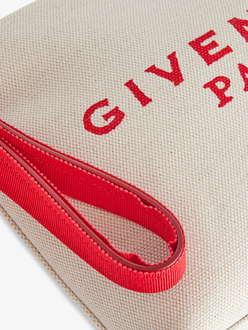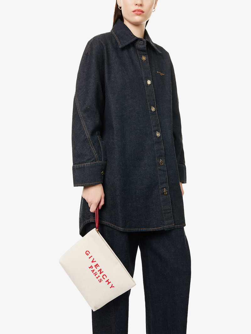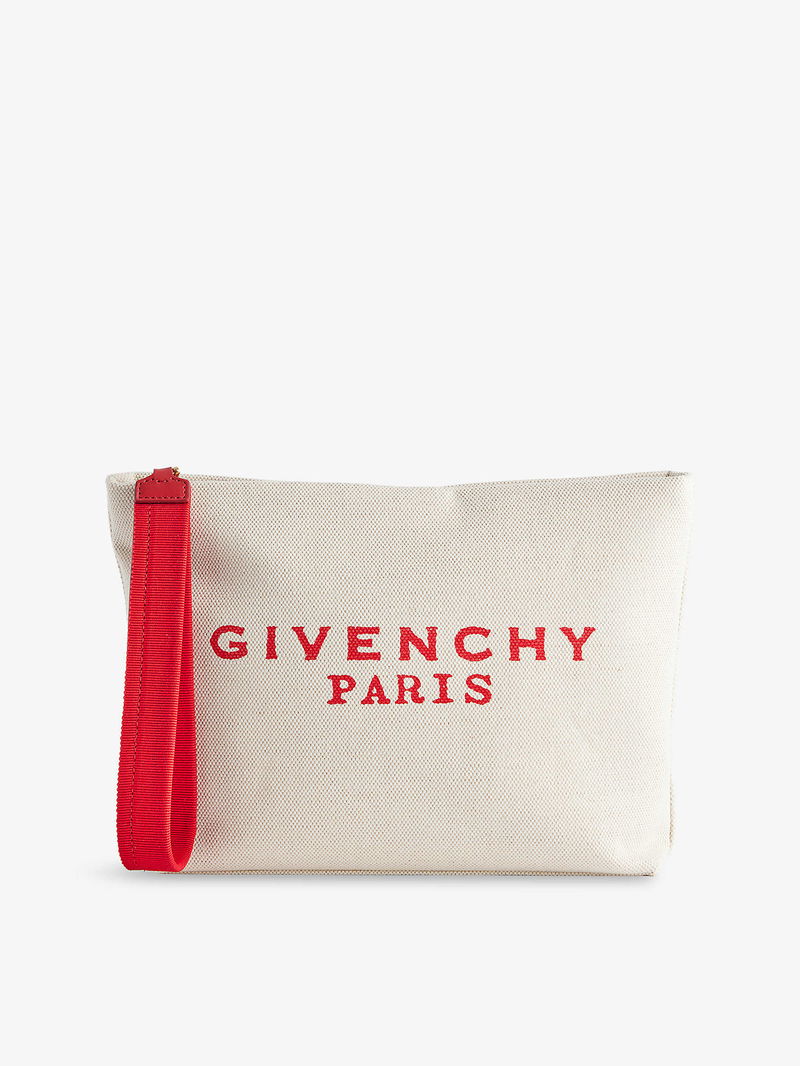Givenchy cotton-blend pouch. Rectangular shape, brand, ribbed wristlet, brand print at front, all-over canvas texture, gold-toned hardware, one main compartment, internal slip pocket and brand patch, fully lined.