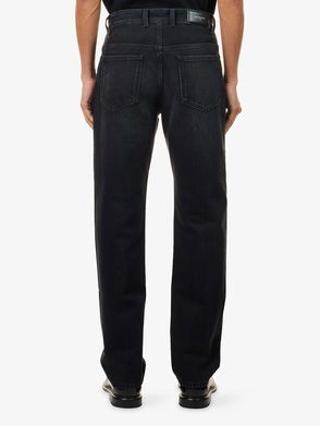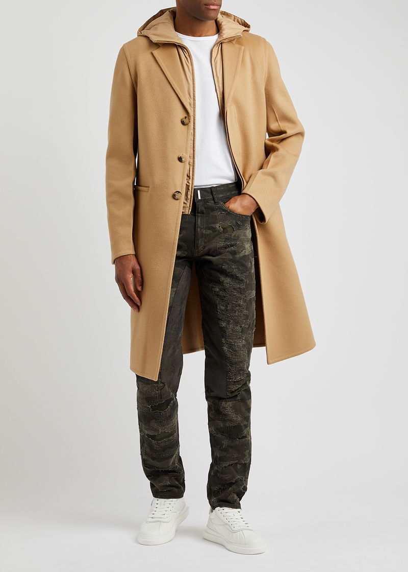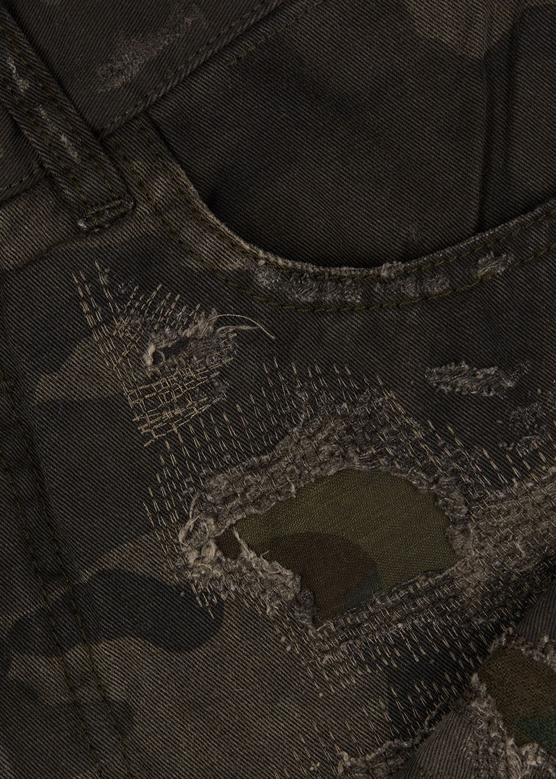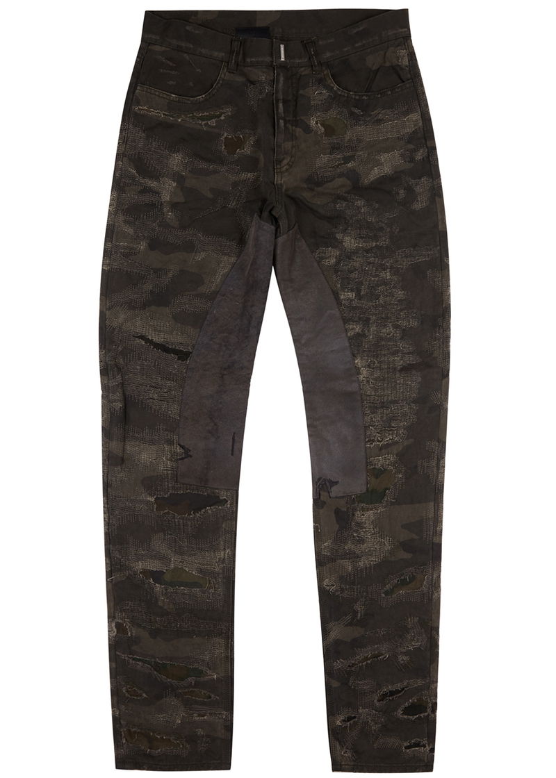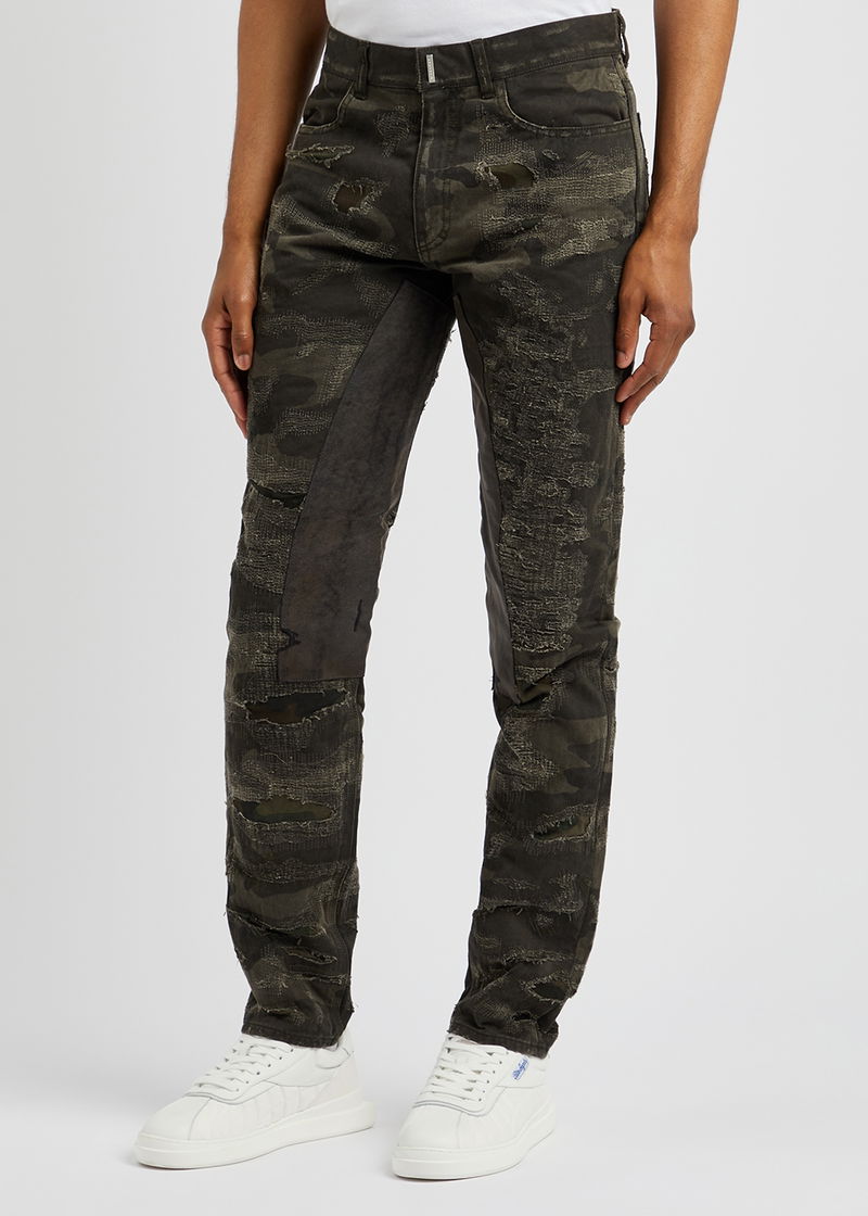 Givenchy tonal green and brown denim jeans. Mid-rise fit, slim-leg cut, camouflage print, distressed details and overlay, belt loops, two front slip pockets, two back patch pockets, silver-tone 4G plaques at back, faux suede and leather panels at inner legs. Concealed hook, button and zip fastening at front.