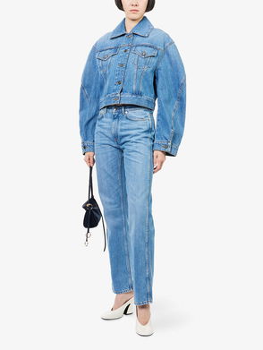 This trucker-inspired jacket is made from dark-wash denim and has a nipped-in waist balanced by voluminous sleeves. The gold-tone buttons are etched with the logo.