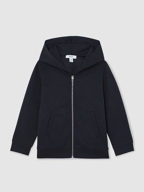 Givenchy Kids black jersey sweatshirt. Drawstring hood, logo print, ripped and distressed, embroidered details, ribbed trims. Slips on.