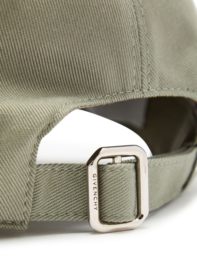 Givenchy canvas cap. Embroidered logo at front, embroidered eyelets, concentric stitching at brim, fully lined. Adjustable clasp at back.