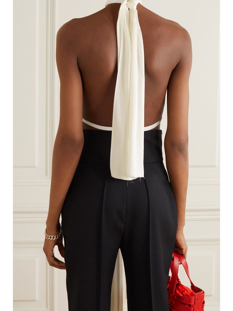 Givenchy's top makes a statement from every angle. It's cut from smooth white crepe that's knotted at the hatlerneck and hem and turns to reveal an open back secured by a slim, adjustable strap. The draped panel at the front falls to an ankle-skimming length and the simple faux pearl embellishment enhances its elegance.