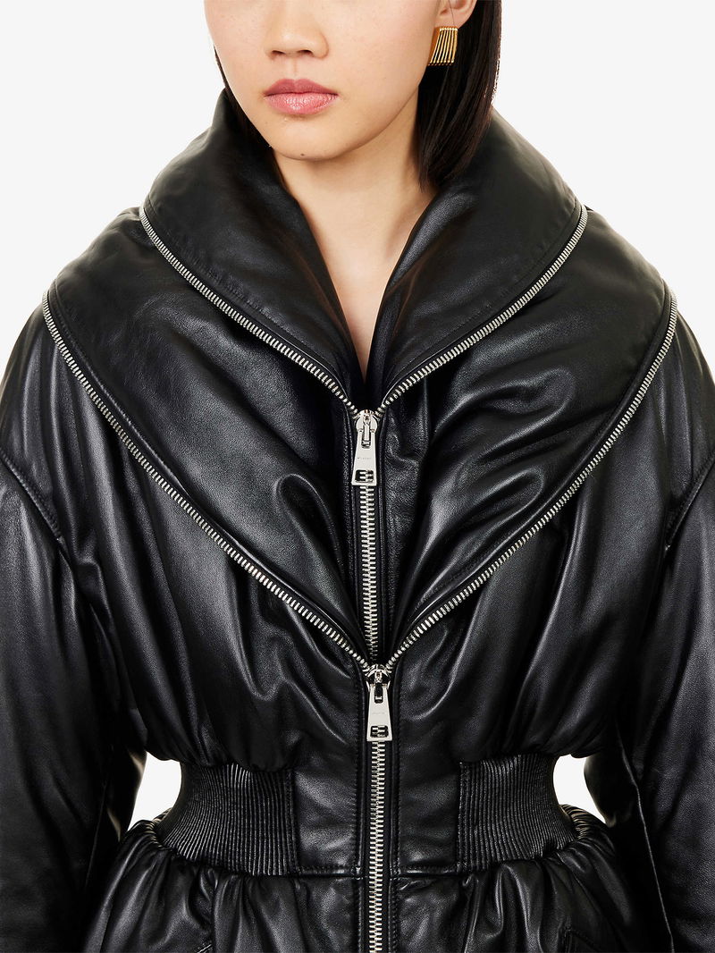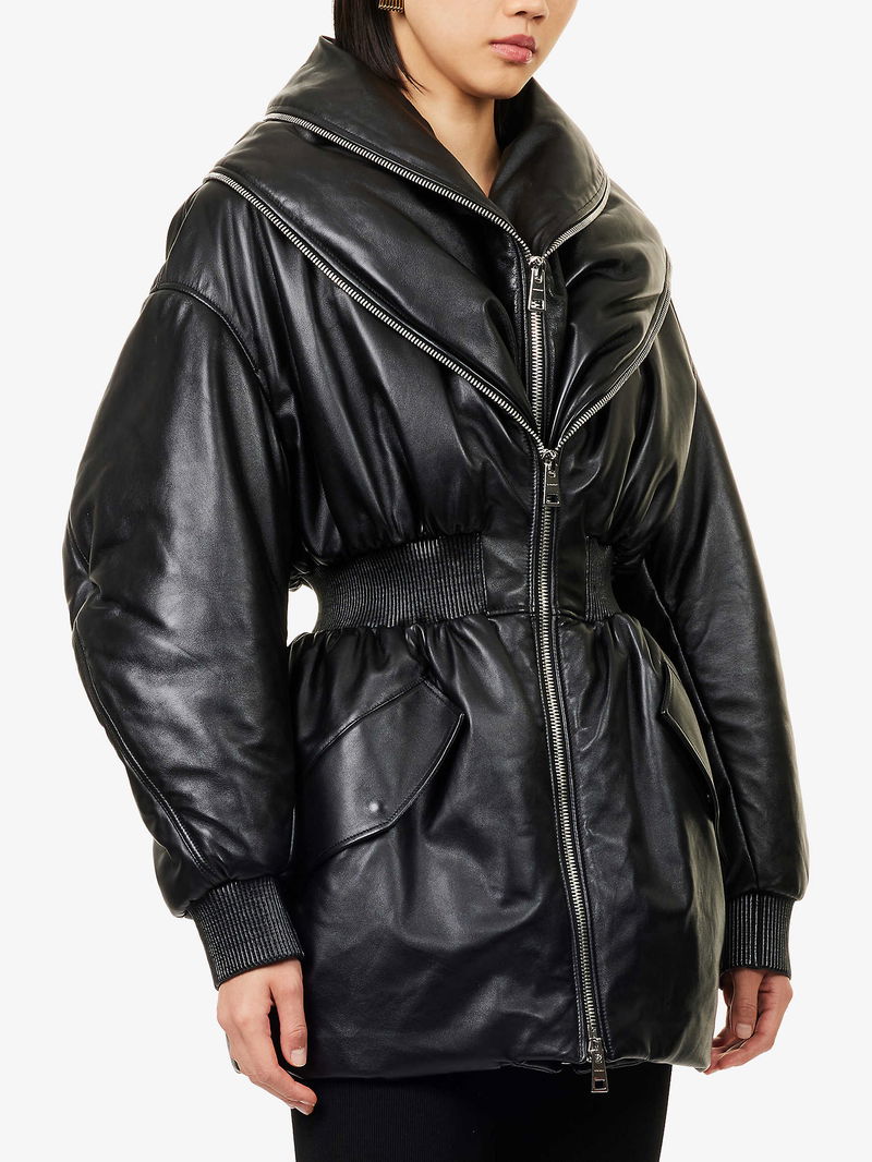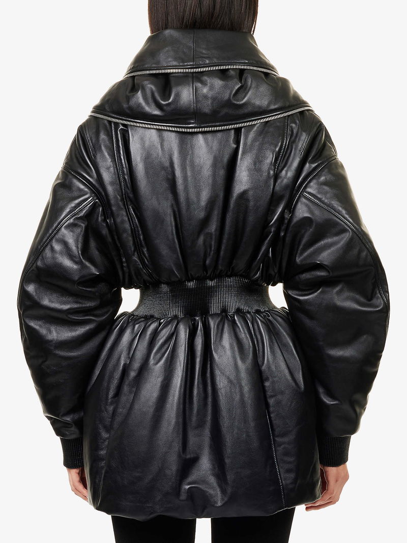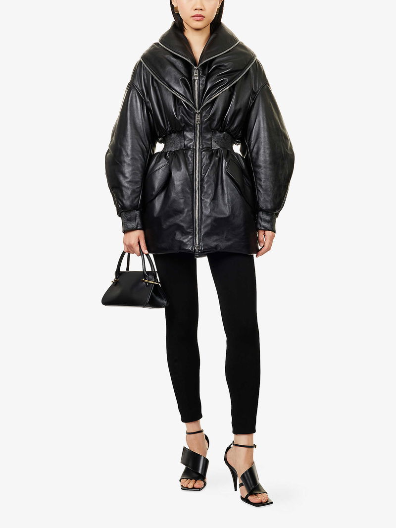 • Regular fit, double shawl-collar, long sleeves, two buttoned pockets at front, cinched elasticated waistband, all-over padded, all-over smooth leather, fully lined