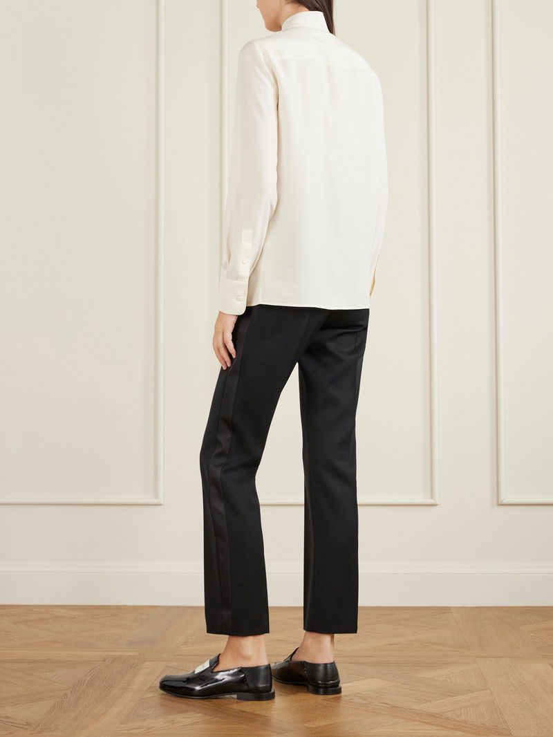 Givenchy's draped blouse demonstrates the art of contemporary elegance. It's been cut in Italy from lightweight silk and has an asymmetric pussy-bow neckline.