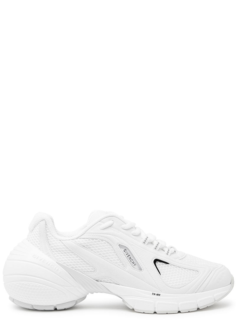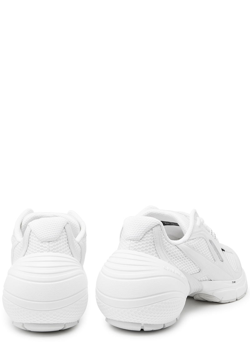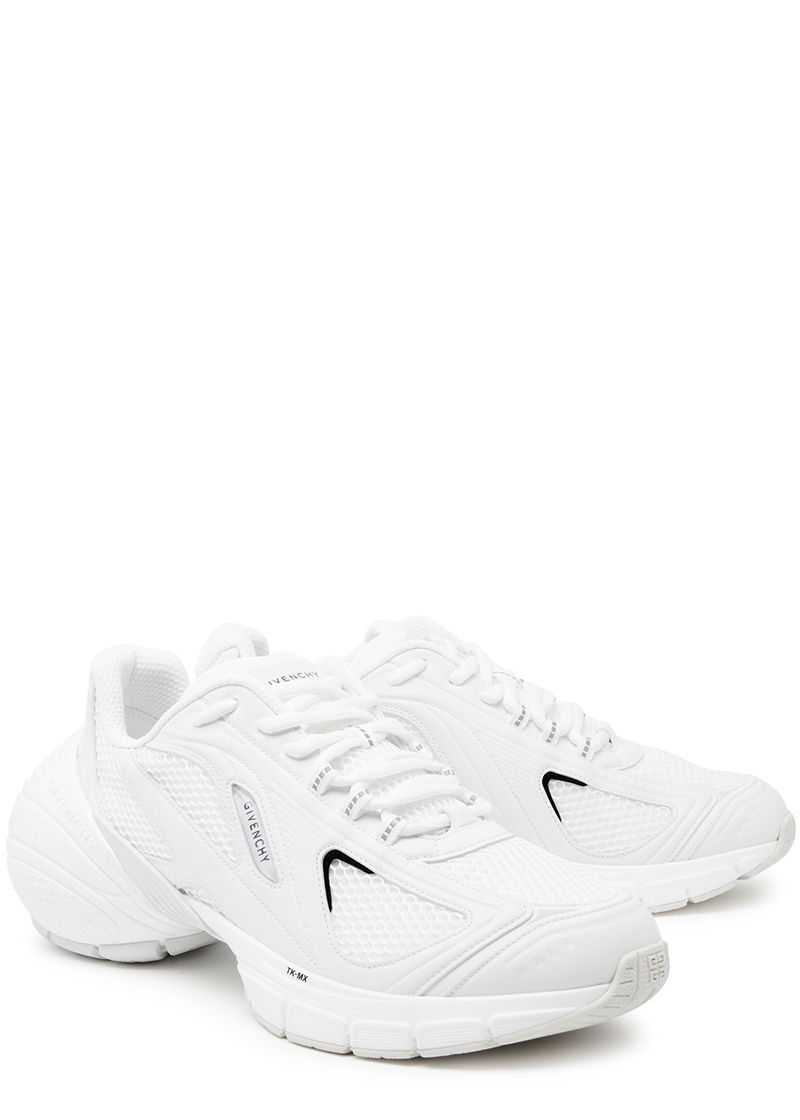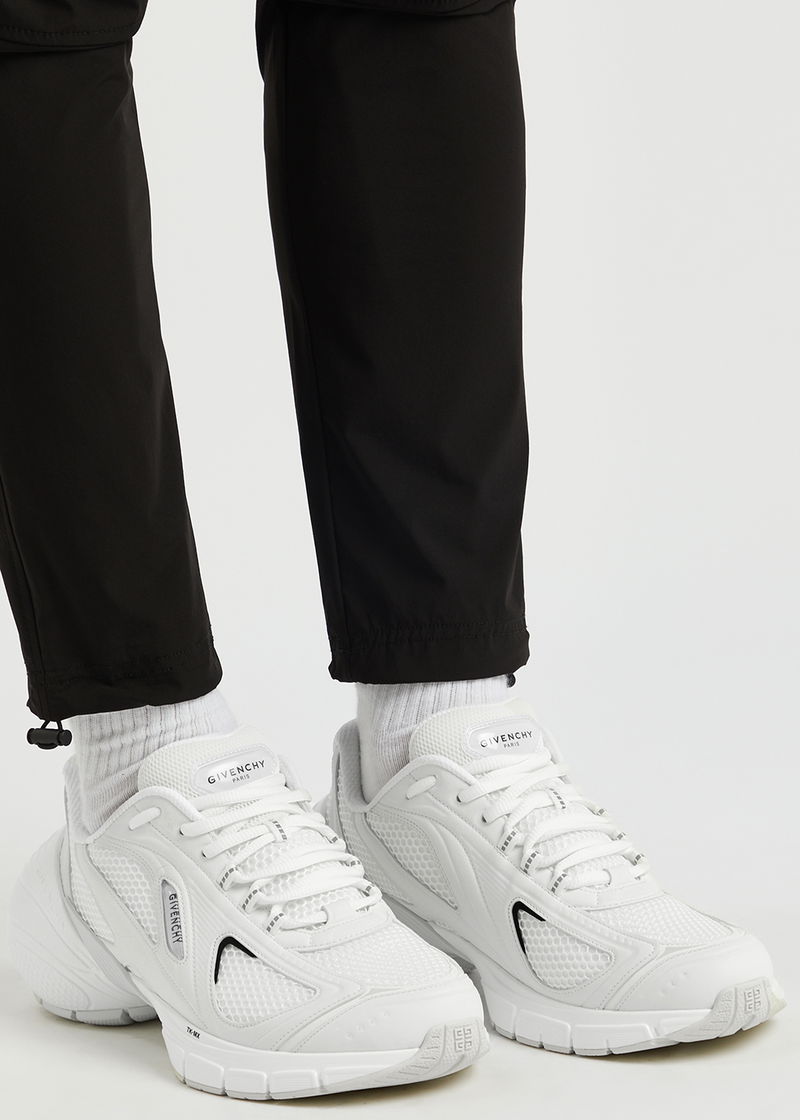 Givenchy mesh sneakers. Designer plaque at padded tongue, rubberised caging, logo print, designer plaque at side, padded ankle, logo embossed sculpted midsole, textured sole, round toe. Lace-up front. Comes with a dust bag.