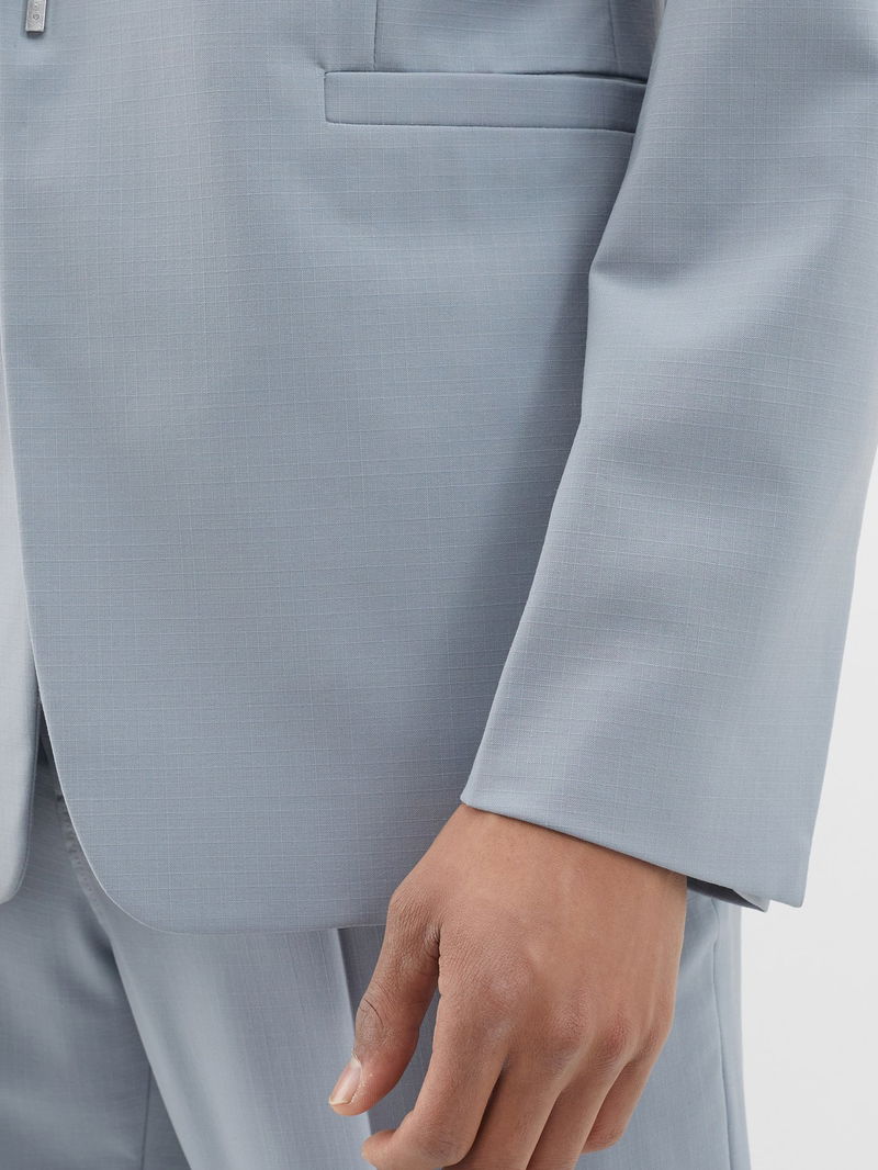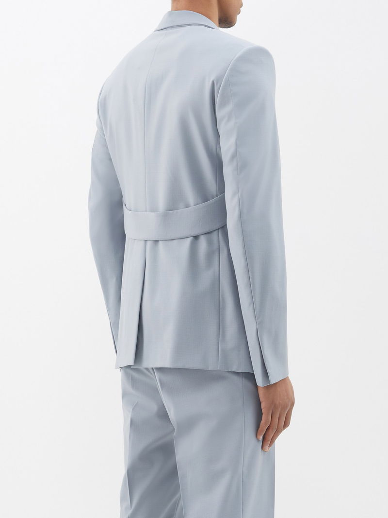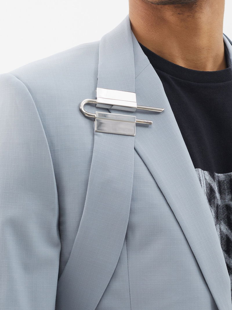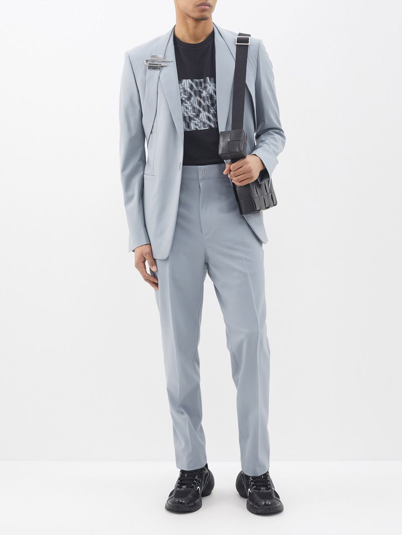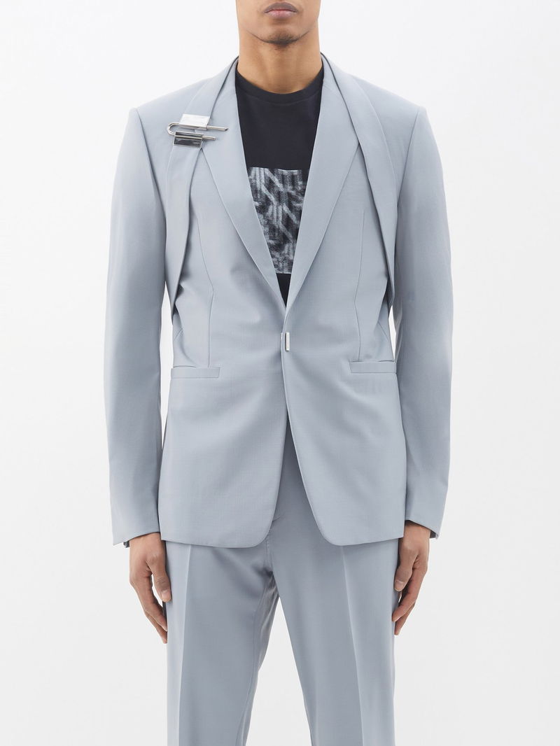 Matthew M. Williams uses industrial codes to inform his rebellious vision showcased by Givenchy’s blue-grey suit jacket, punctuated with a silver U lock on the harness strap.