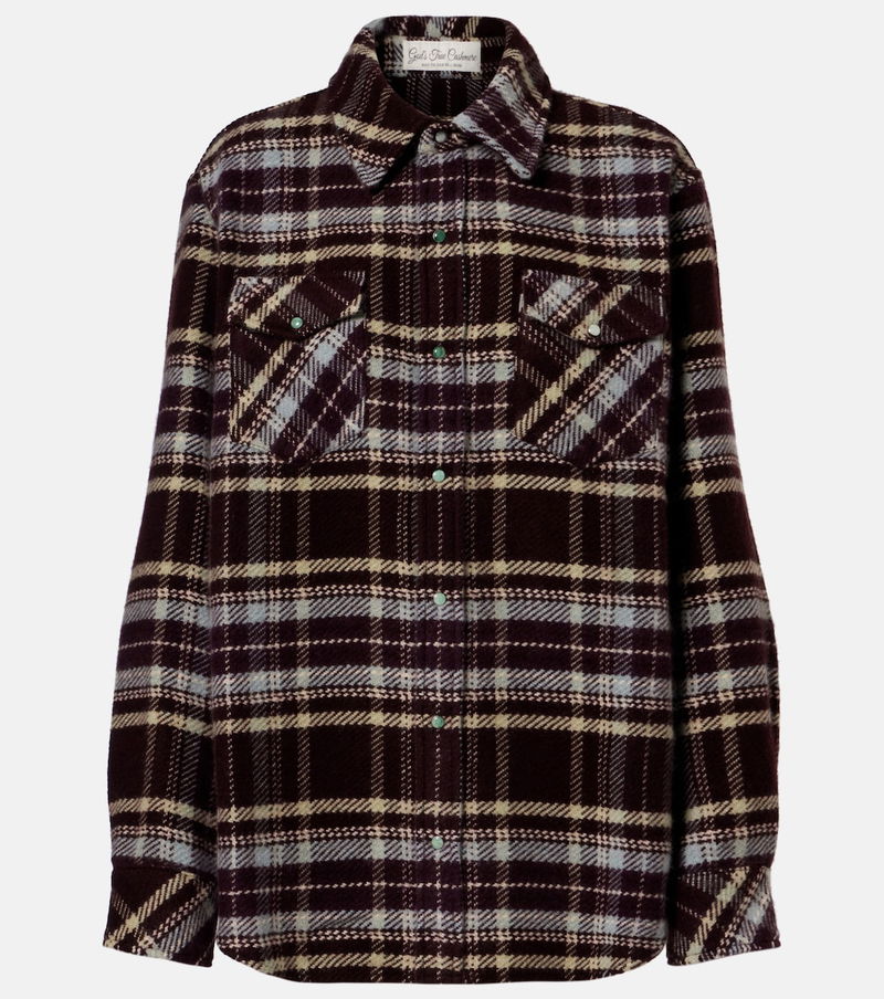 Made from pure cashmere, this shirt features a plaid design and emerald snap buttons. Each God’s True Cashmere shirt is adorned with hand-carved gemstones at the placket, pockets, and cuffs, thoughtfully selected for their positive qualities.