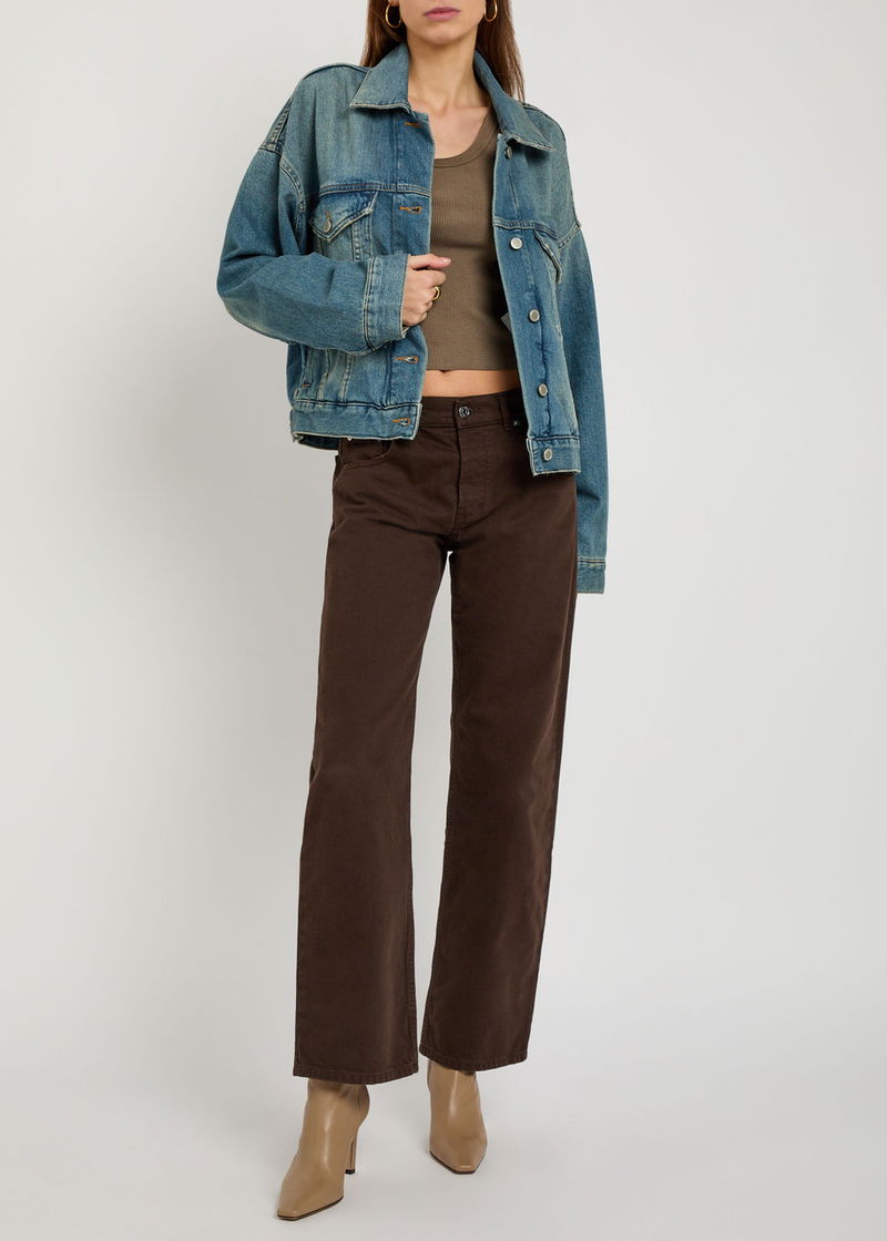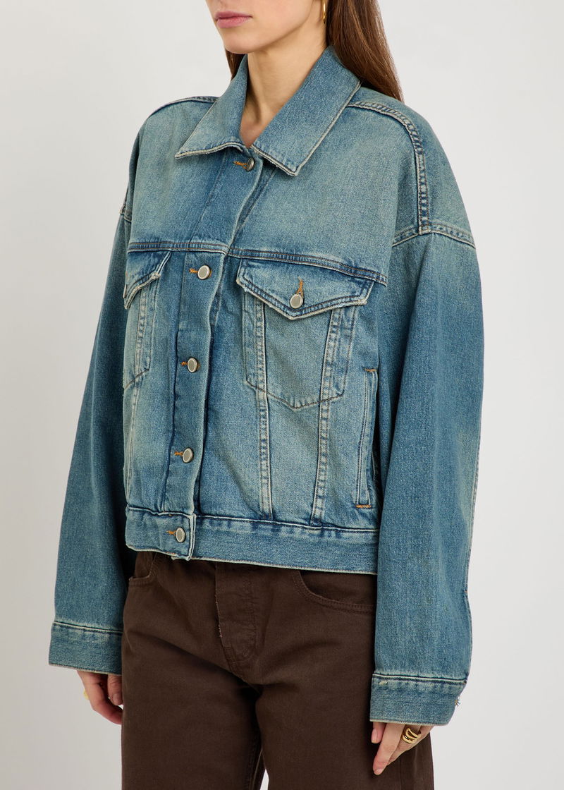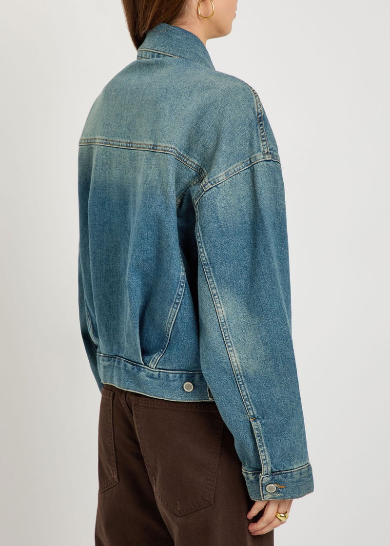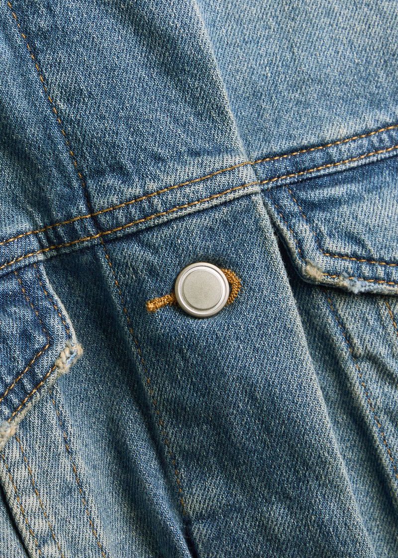 Good American denim jacket. Dropped shoulders, button-fastening neck, button-fastening front flap pockets, side slip pockets, box pleat at back, adjustable button-fastening tabs at back hem, washed and faded finish. Button fastenings through front.