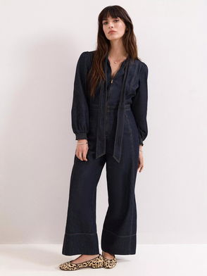 Good American denim jumpsuit. Panelled, chest patch pockets, belt loops, detachable waist tie, side slant pockets, back patch pockets, contrasting stitching, faded finish