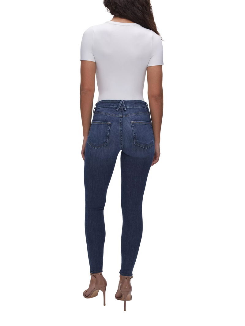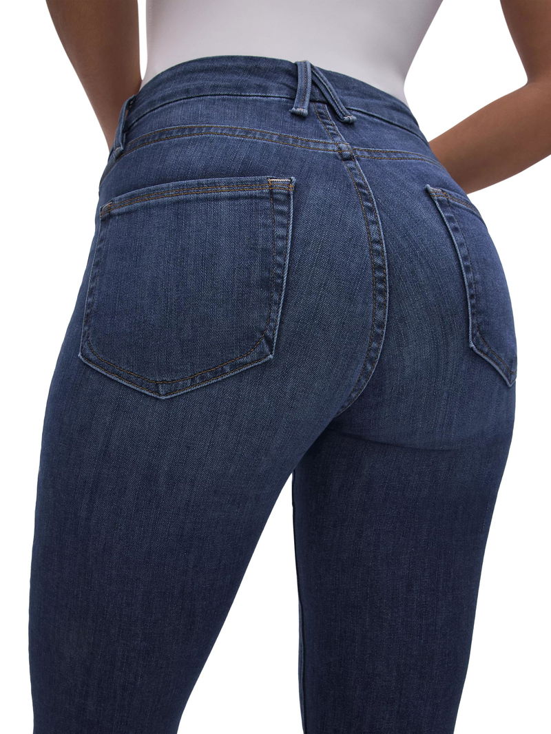 Good American designs jeans, bodysuits, swimwear and other everyday basics for women with body positivity and inclusivity in mind. Sizes run from 4 to 28, and pieces are shown on different sized models. The B-Corp certified brand was created by Khloe Kardashian and Emma Grede.