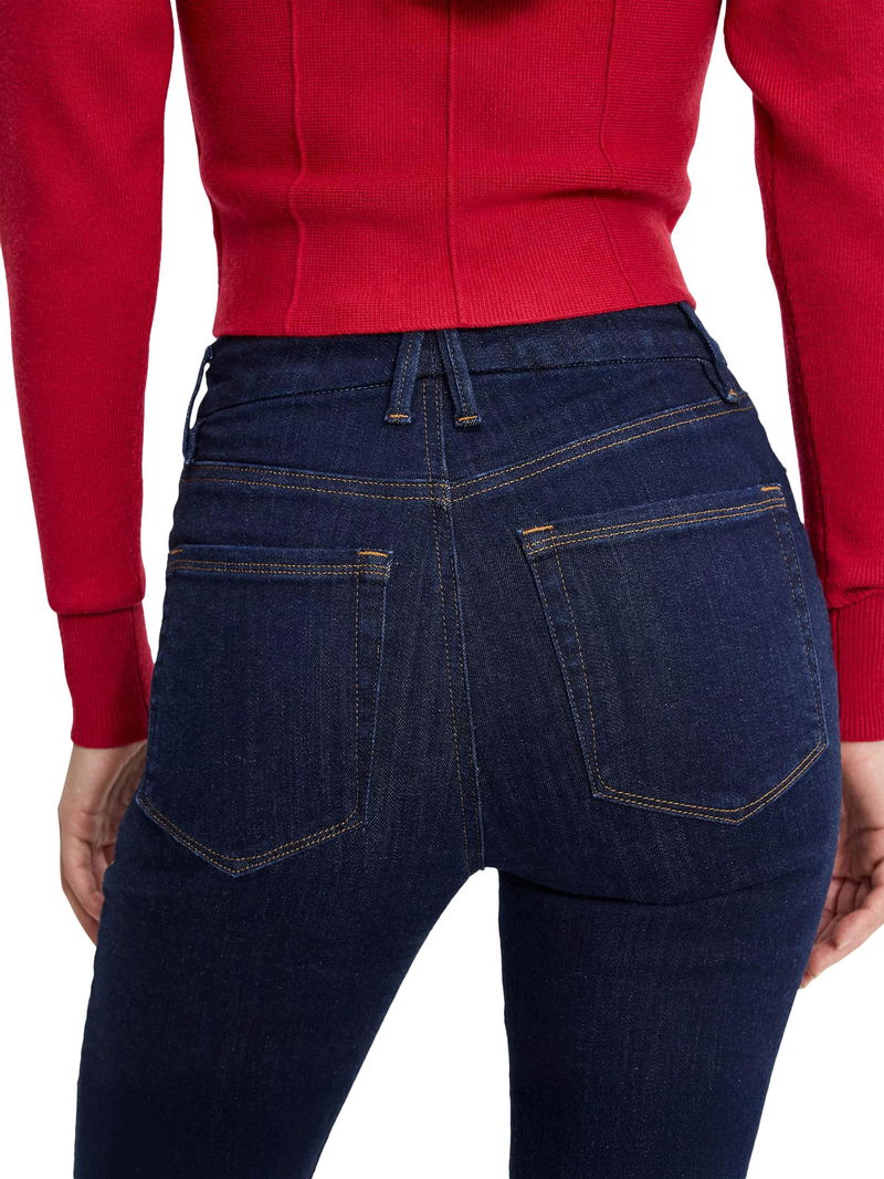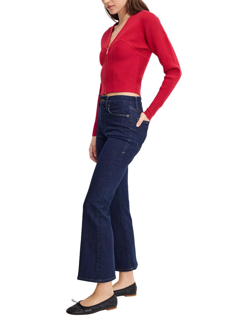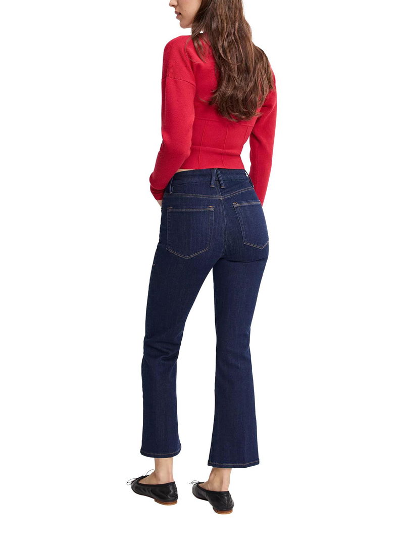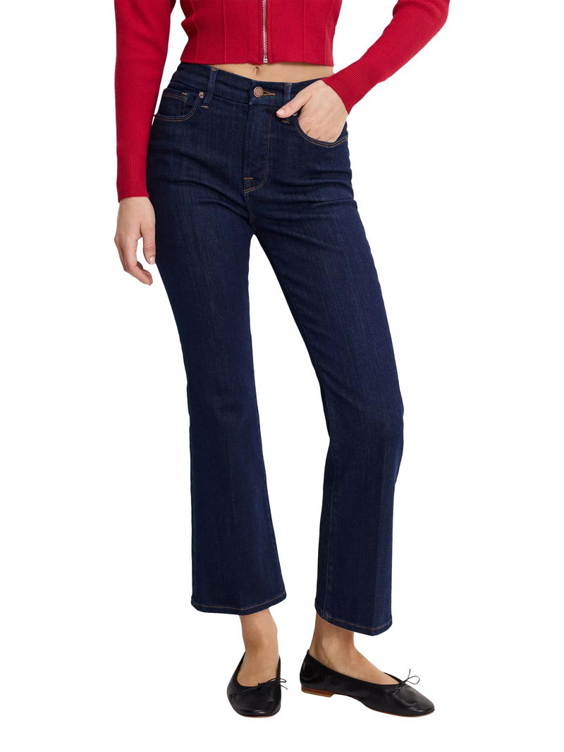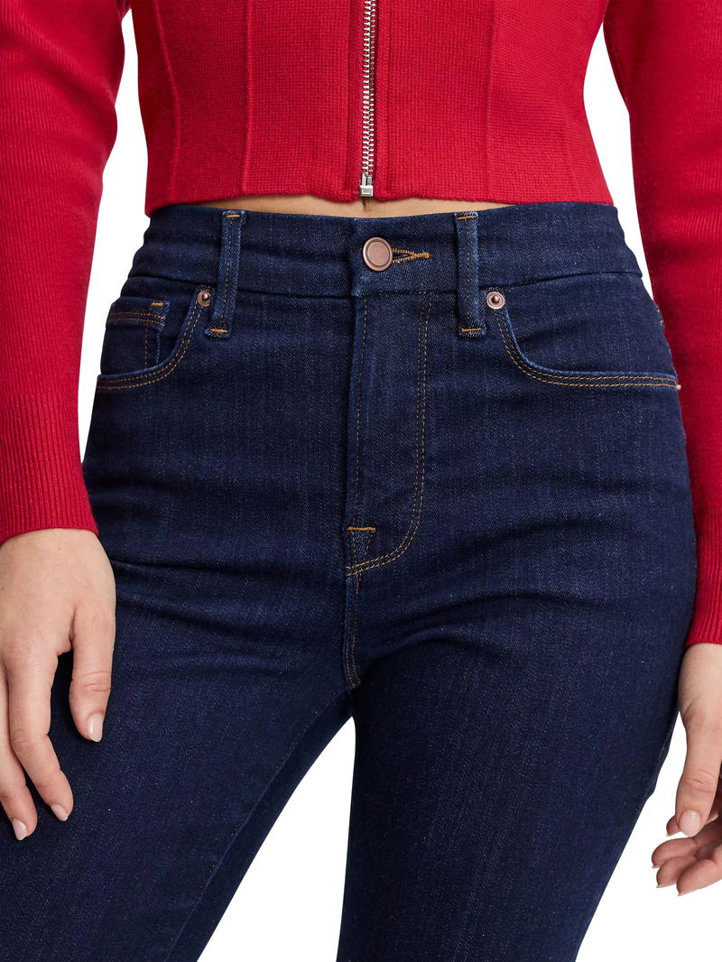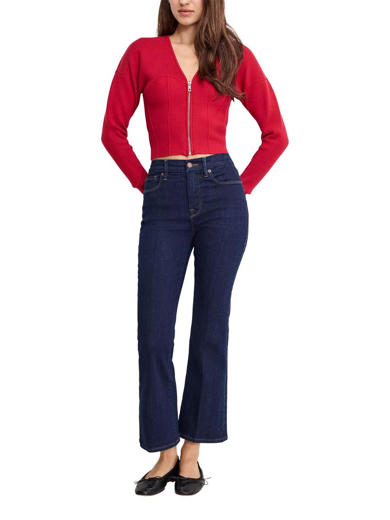 A pair of cropped bootcut jeans from Good American, made from soft stretch denim with a comfortable mid rise and a zip fly.