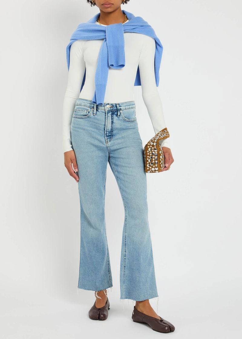 Good American designs jeans, bodysuits, swimwear and other everyday basics for women with body positivity and inclusivity in mind. Sizes run from 4 to 28, and pieces are shown on different sized models. The B-Corp certified brand was created by Khloe Kardashian and Emma Grede.