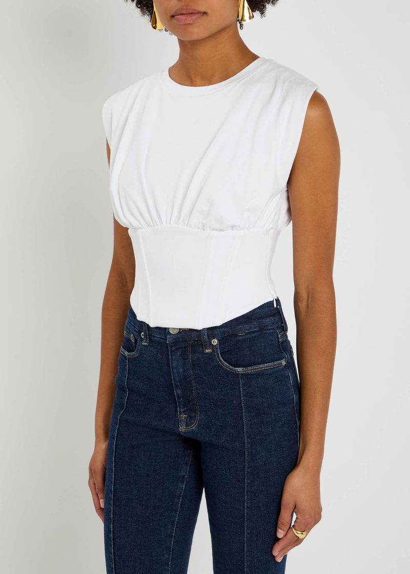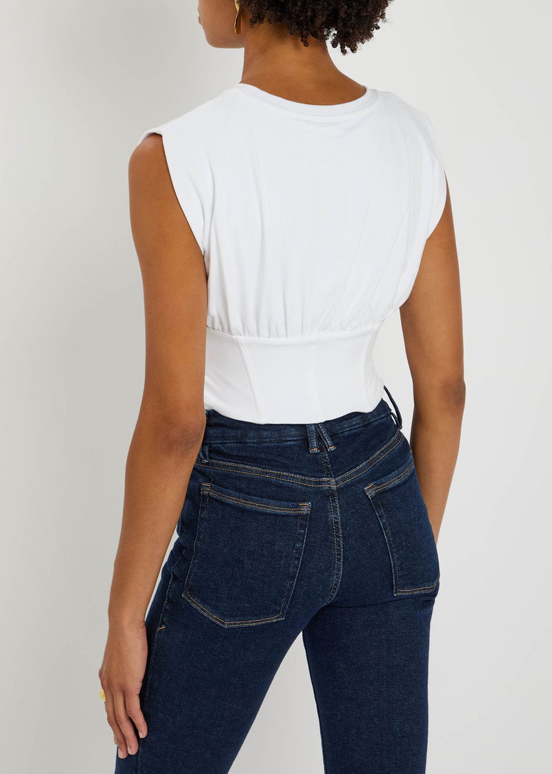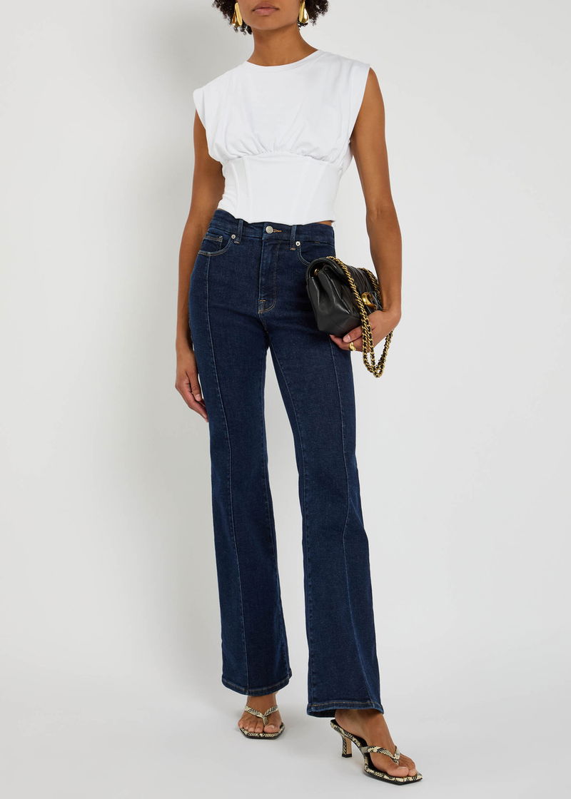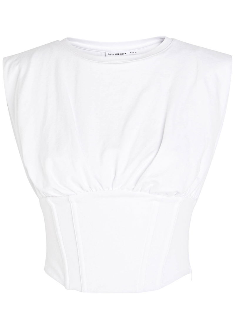 Good American designs jeans, bodysuits, swimwear and other everyday basics for women with body positivity and inclusivity in mind. Sizes run from 4 to 28, and pieces are shown on different sized models. The B-Corp certified brand was created by Khloe Kardashian and Emma Grede.