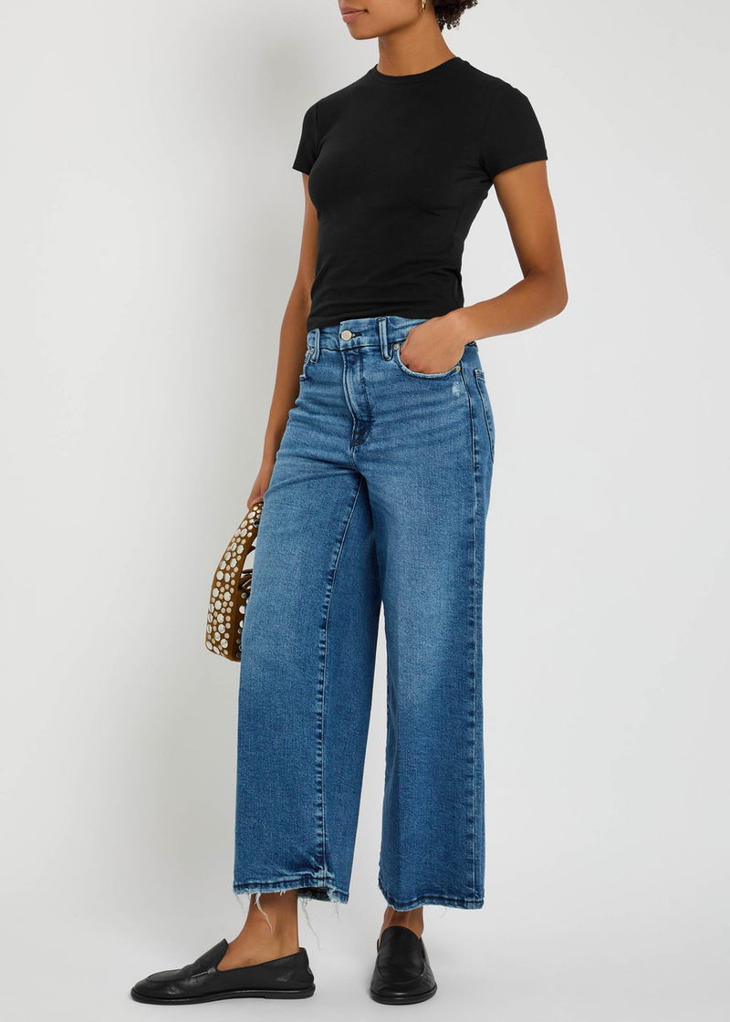 Good American designs jeans, bodysuits, swimwear and other everyday basics for women with body positivity and inclusivity in mind. Sizes run from 4 to 28, and pieces are shown on different sized models. The B-Corp certified brand was created by Khloe Kardashian and Emma Grede.