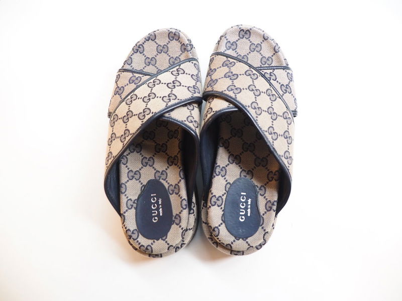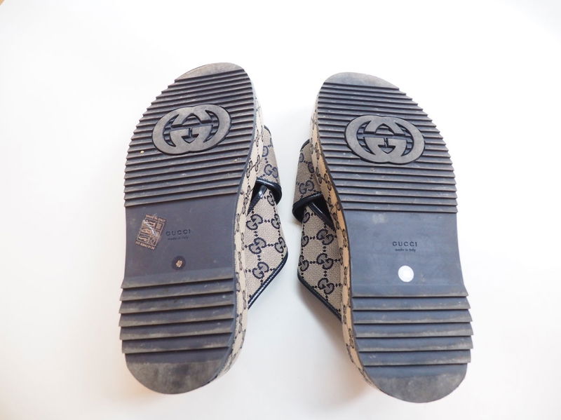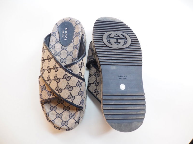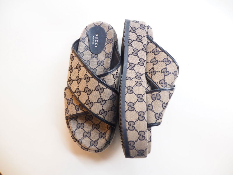 Crafted in Italy from Gucci's signature GG-supreme canvas, these grey Angelina sandals feature a crossover strap set on a chunky flatform sole.