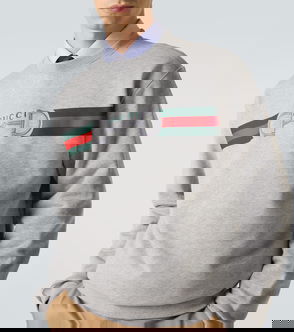 Gucci cotton-jersey sweatshirt. Slips on. Relaxed fit, round neck, dropped shoulders, long sleeves, brand print at chest, ribbed trims.