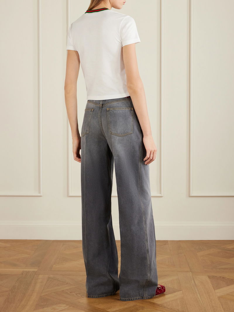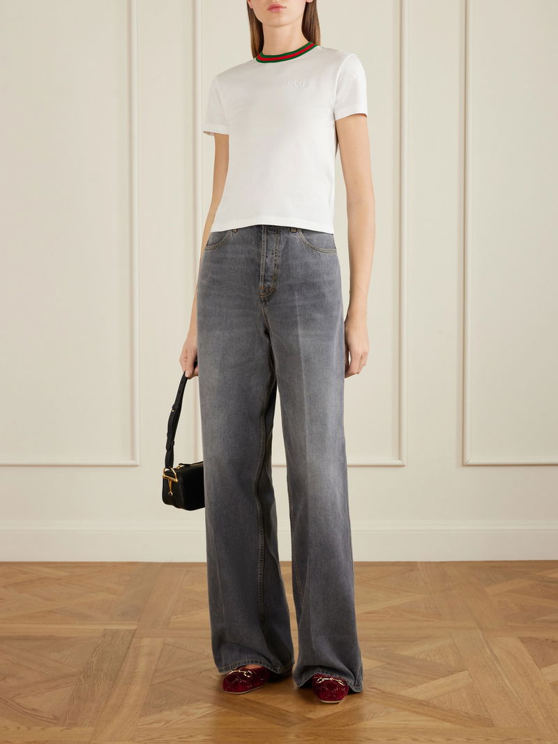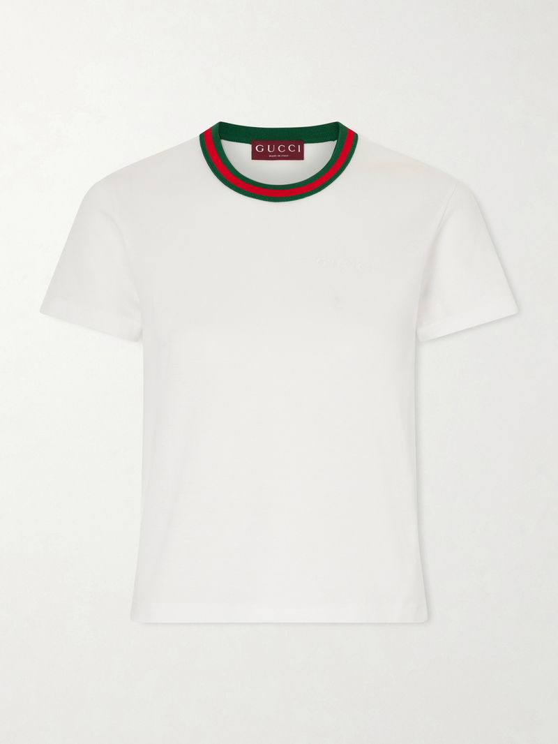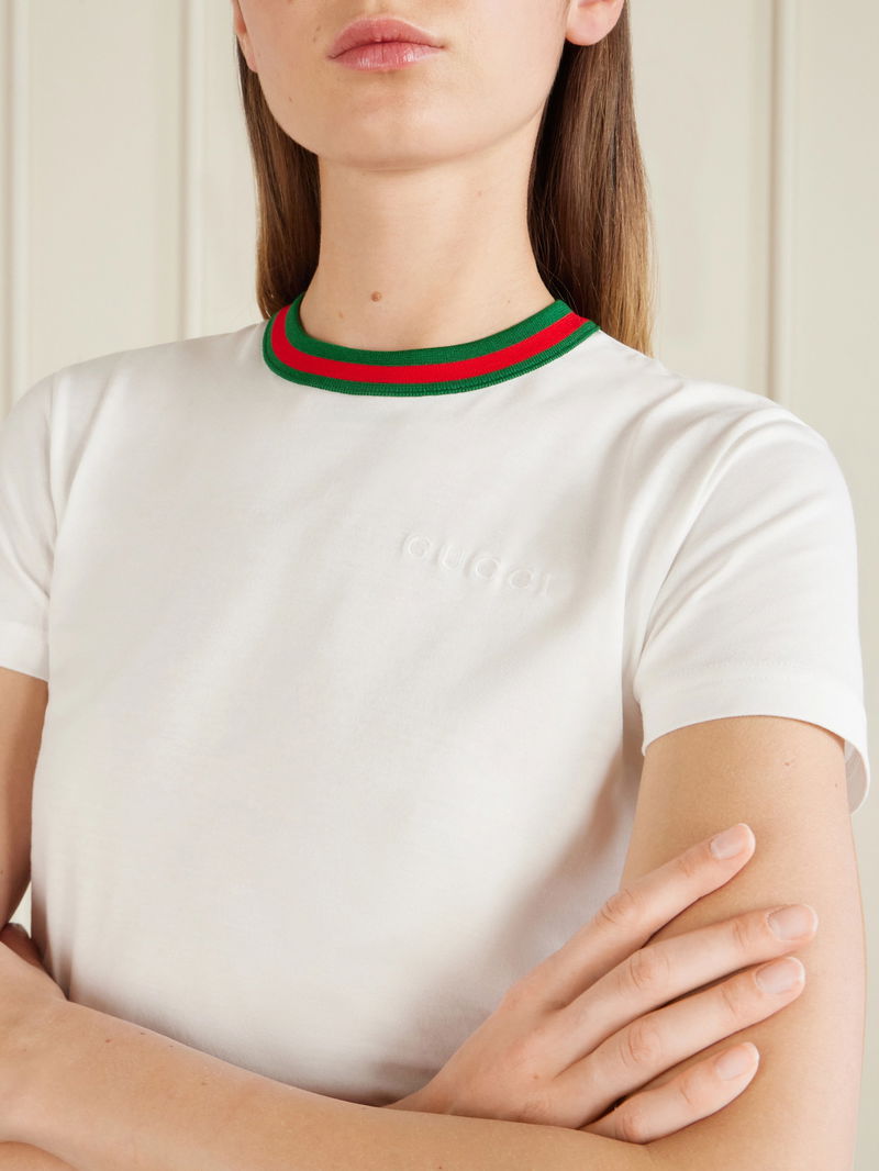 Cropped Striped Embroidered Cotton-jersey T-shirt