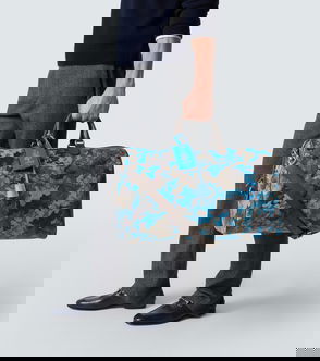 The Gucci Edge Medium duffel bag from Gucci is crafted from GG-debossed matte fabric, a historic interpretation of founder Guccio Gucci's initials. The design features a luggage tag, structured top handles, and a detachable strap.