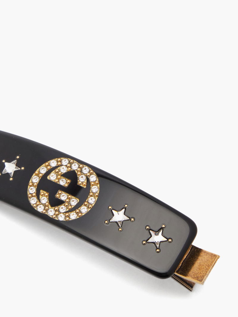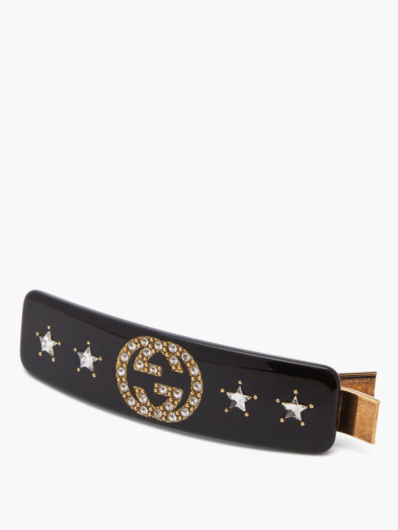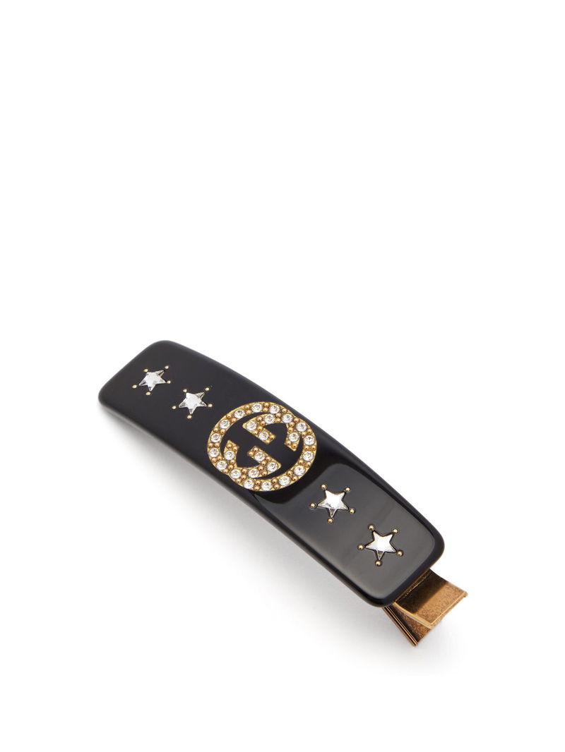 Bring an opulent edge to everyday looks with Gucci’s black hair clip, showcasing the house's GG motif traced in glittering crystals. It’s made in Italy from glossy resin that’s set with round-cut and star-shaped stones, then secures with an antiqued gold-tone brass clip for a vintage finish. Use it to pin back tousled waves.